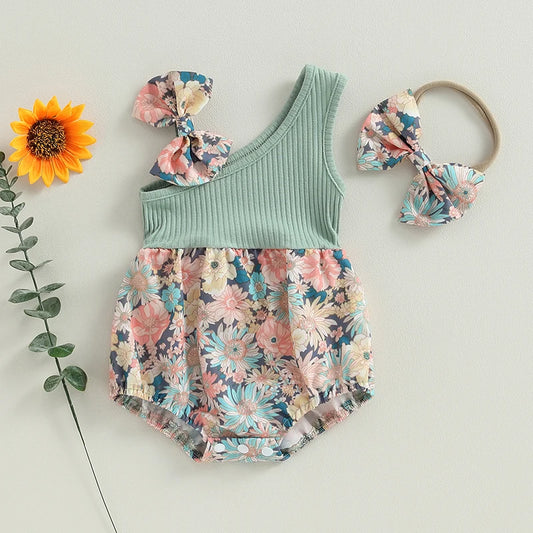 Baby Girls Flower Print Romper with Bow & Headband