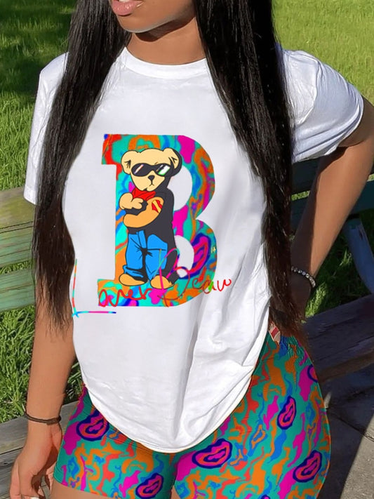 Multicolor Two Pieces Shorts Suits Cartoon Mixed Print Shorts Set Short Sleeve Pullover White Print Bottoms Outfits
