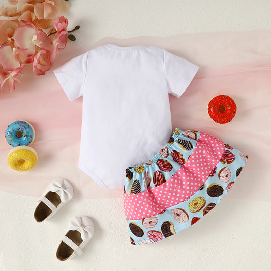 Newborn Baby Girl Summer Letter Sweet Short Sleeved Triangle Climbing Suit + Donut Dot Patchwork Short Skirt