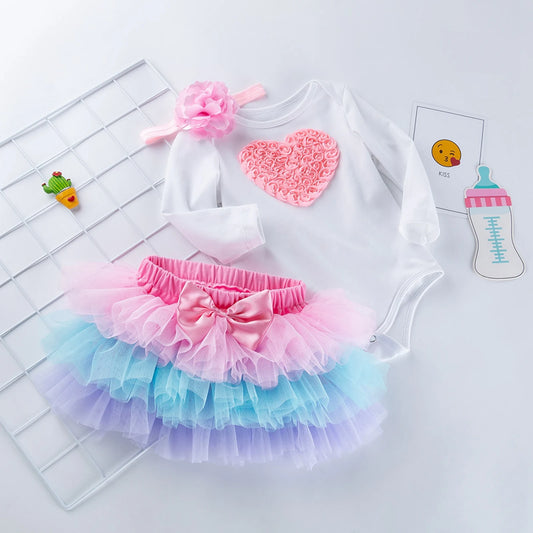 3Pcs Baby Clothes Birthday Outfits 3D Number/Heart O-Neck Long Sleeves Romper + Tutu Skirt + Headband for Girls 0-24 Months