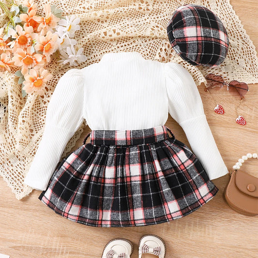 3Pcs Kids Girl Clothes Fall Outfit Solid Color Ribbed Long Puff Sleeve Tops Plaid A-Line Skirt Beret Set Fashion Clothes