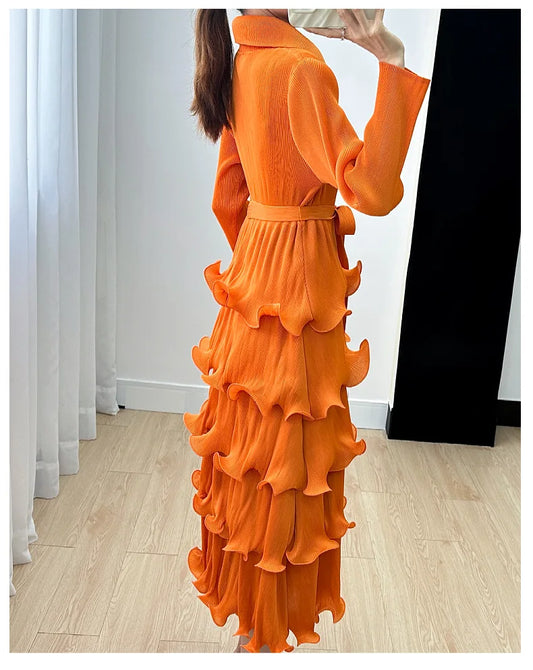 Pleated Wood Ear Edge Maix Dress for Women's w Vintage Cake Skirt Spliced Lapel Mid Length Dress