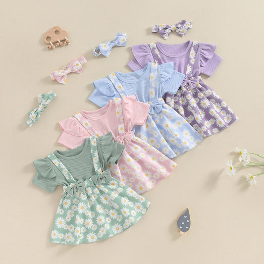 Princess Bowknot Kids Girls Dress with Headbands Summer Short Sleeve Flower Print Patchwork Toddler Dresses Children Clothes