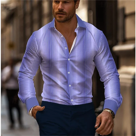 Striped men's business casual 3D printed shirt street daily wear spring and summer lapel long-sleeved 5XL stretch fabric shirt