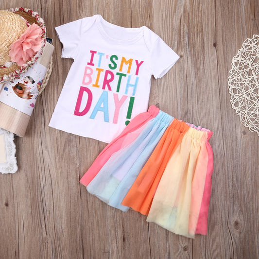 UK It’s My Birthday T-Shirt Tutu Skirt Baby Kids Girls Party Colourful Dress Set Summer Clothing