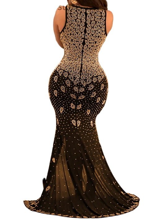 Sexy V-Neck Mesh Rhinestone Mermaid Dress