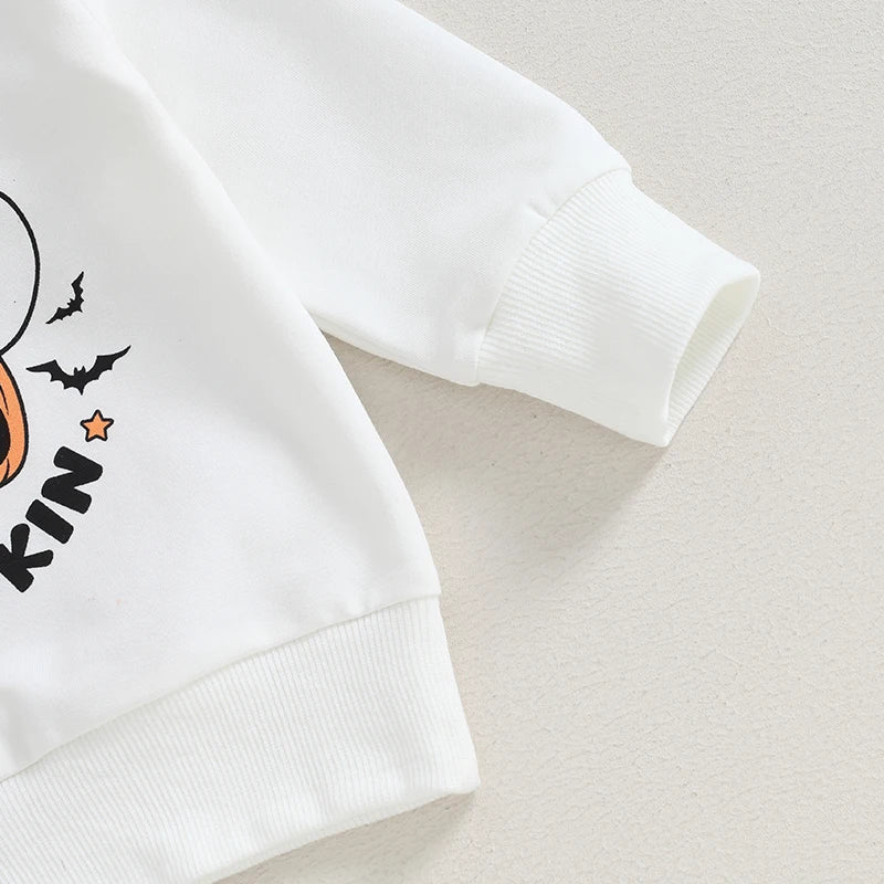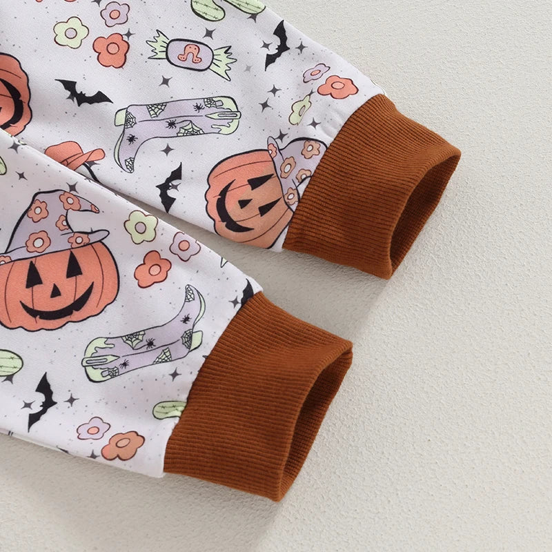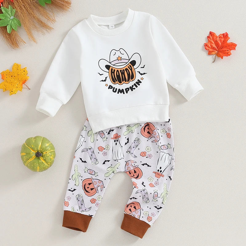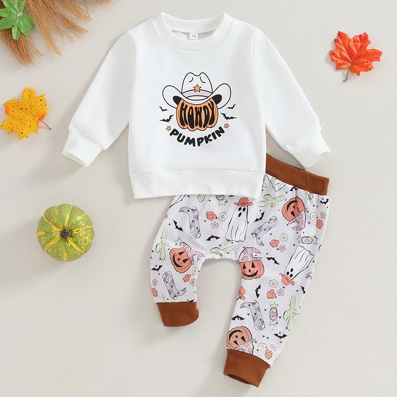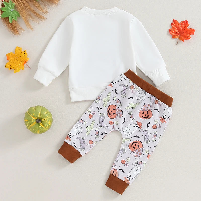 2Pcs Baby Boys Clothes Halloween Set Long Sleeve Crew Neck Letters Print Sweatshirt with Pumpkin Ghost Sweatpants Fall Clothes