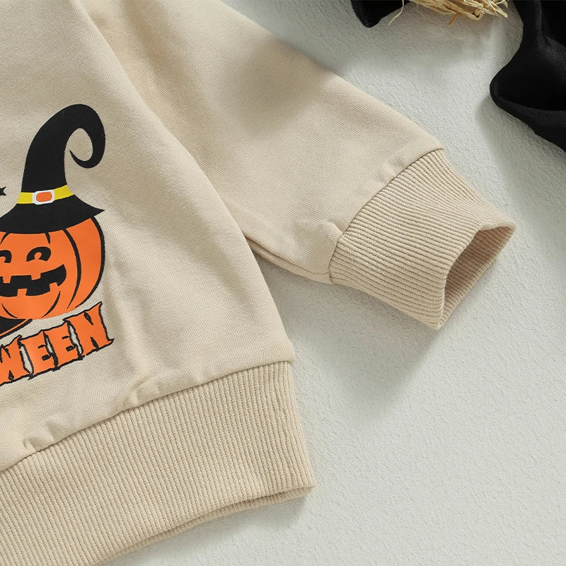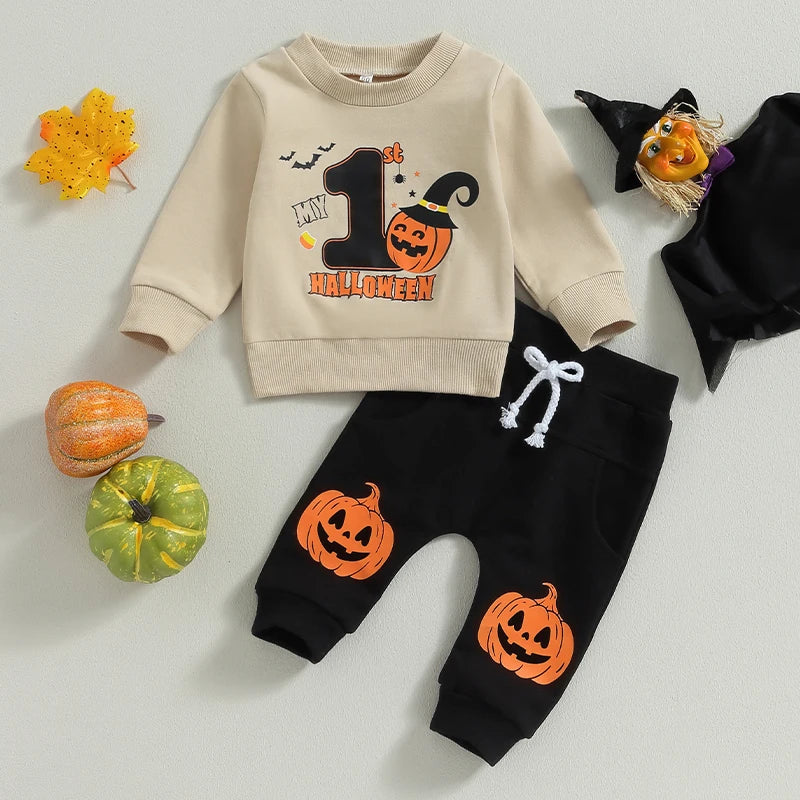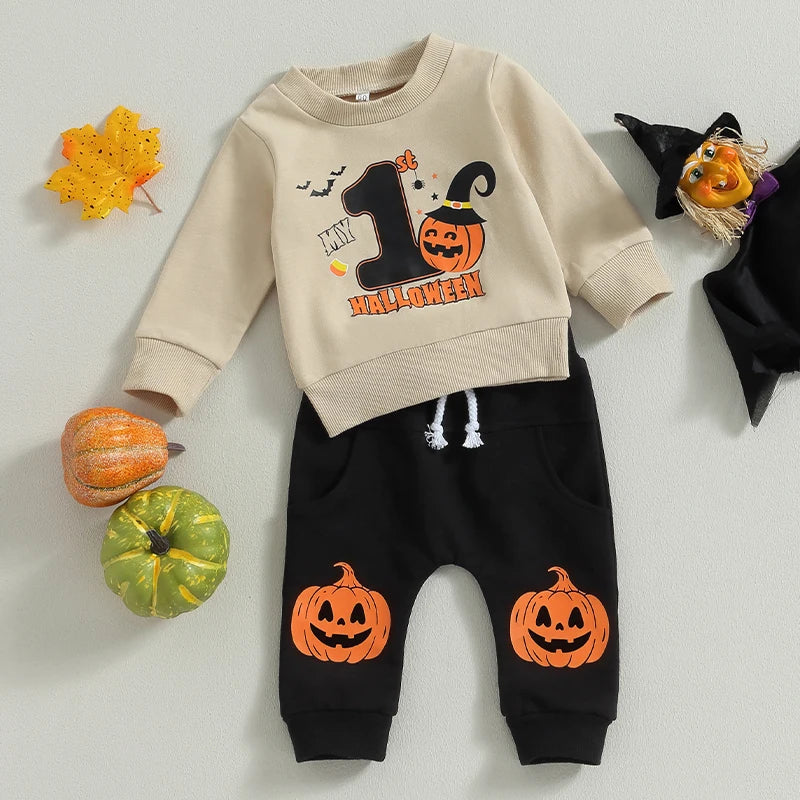 2Pcs Toddler Boys Fall Clothes Set 1st Halloween Outfits Pumpkin Bat Letter Print Long Sleeve Sweatshirts and Long Pants
