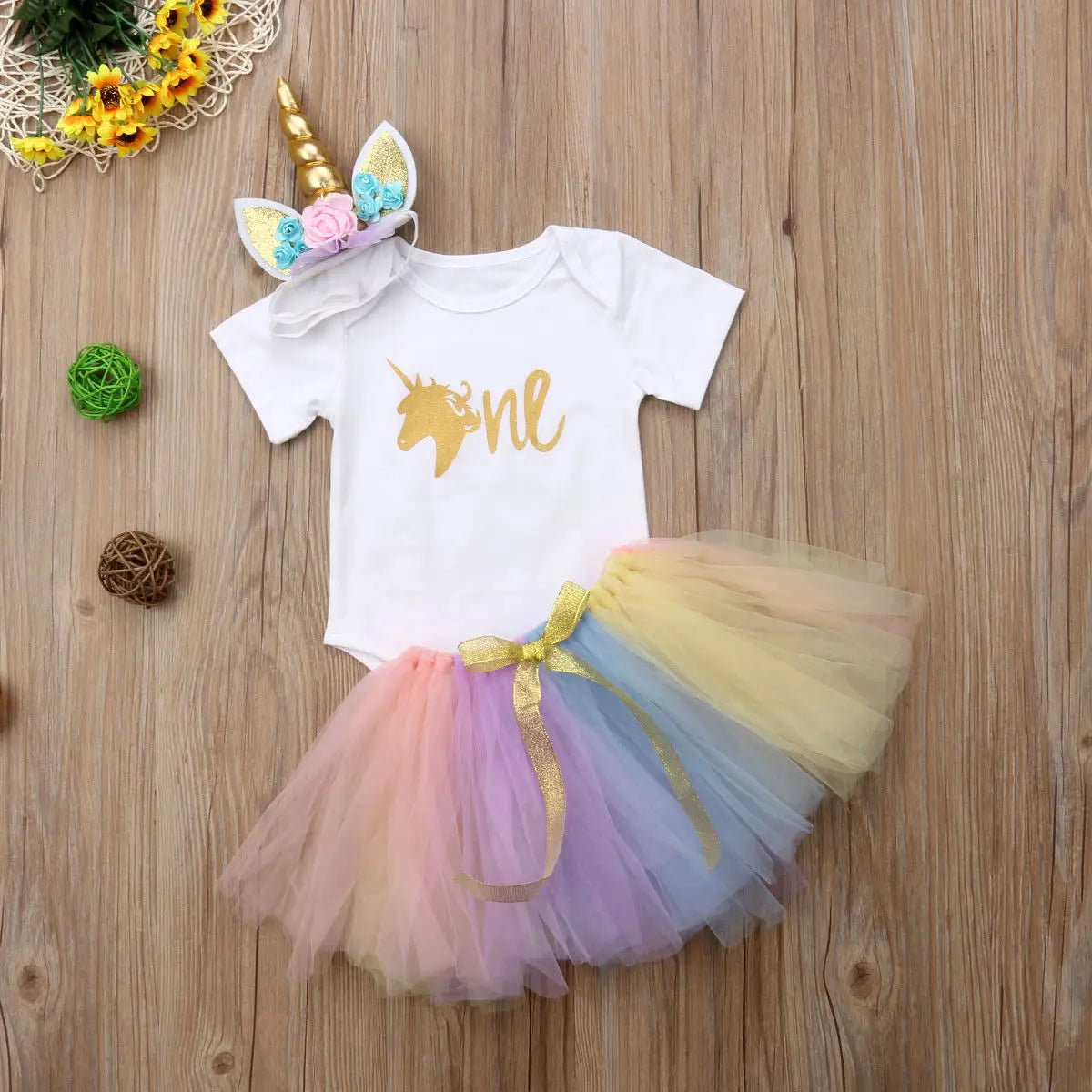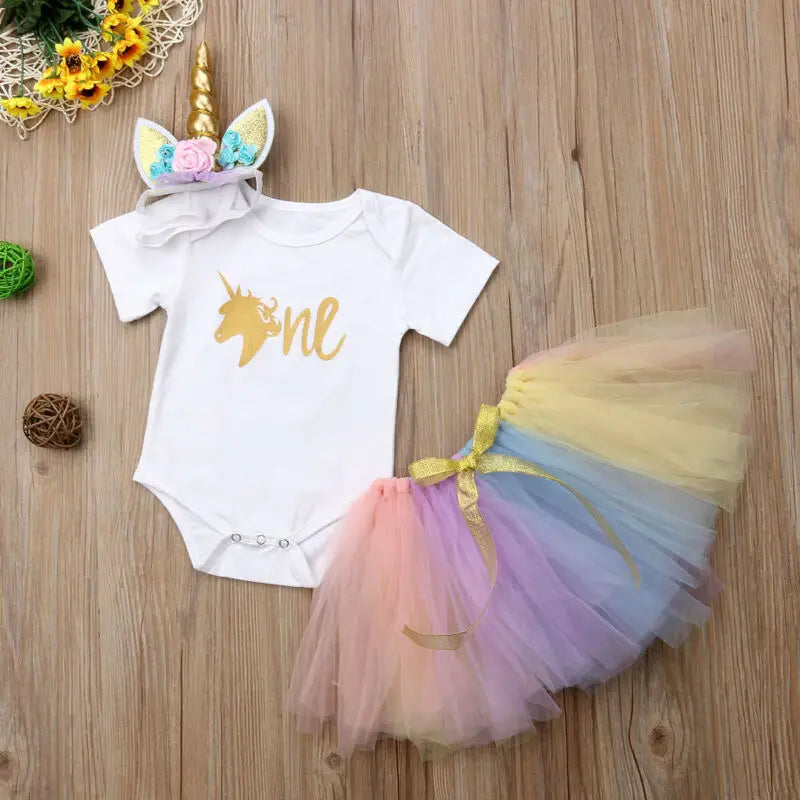 3PCS Baby Girl 1st Birthday Outfit Party Print Romper Cake Smash Tutu Dress Tulle Skirts Headband 0-24 Months