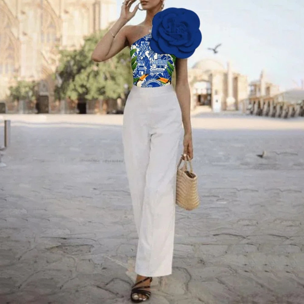 Blue Fashion Printed One-Piece Swimsuit Single Shoulder