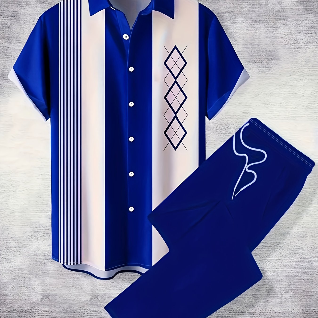 Step into effortless style with this 2-piece Men's Casual Lapel Suit featuring a sleek geometric pattern. Crafted from smooth polyester with a slight stretch, it ensures comfort and flexibility for any spring or fall getaway. The loose fit provides relaxed elegance, while the machine-washable fabric makes maintenance simple. Perfect for men who want to combine bold design with practical wearability.
