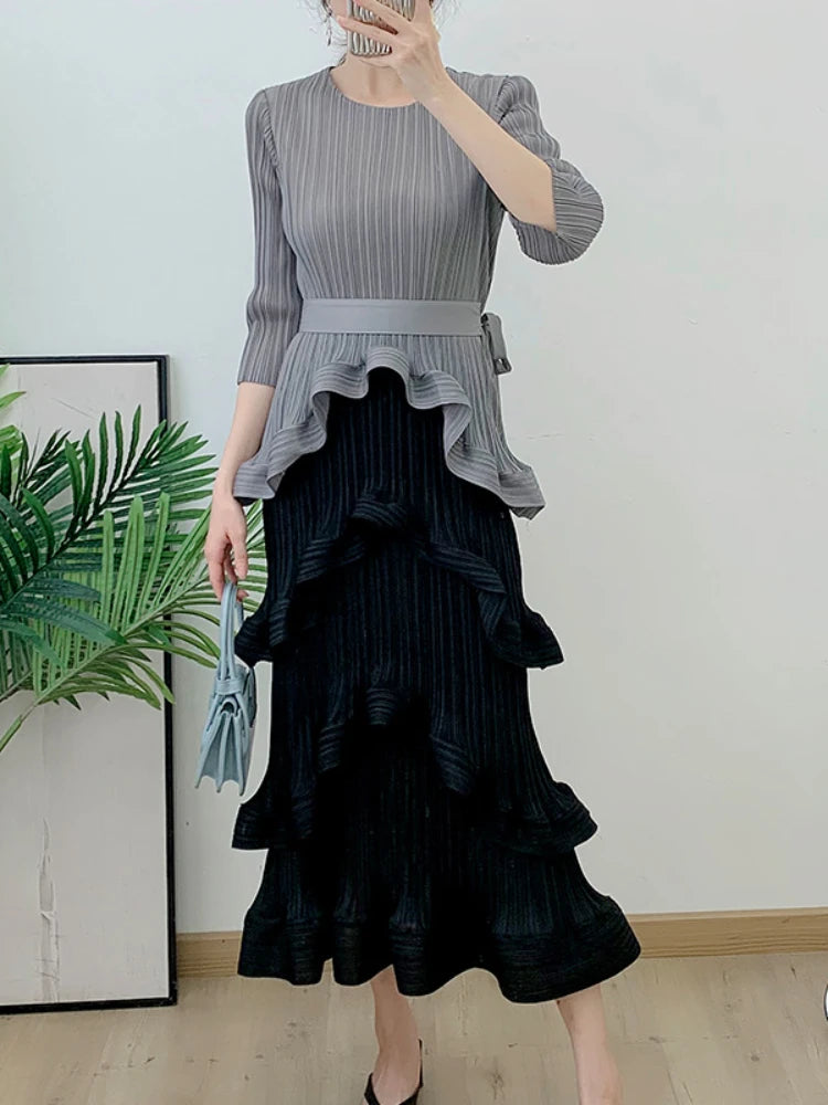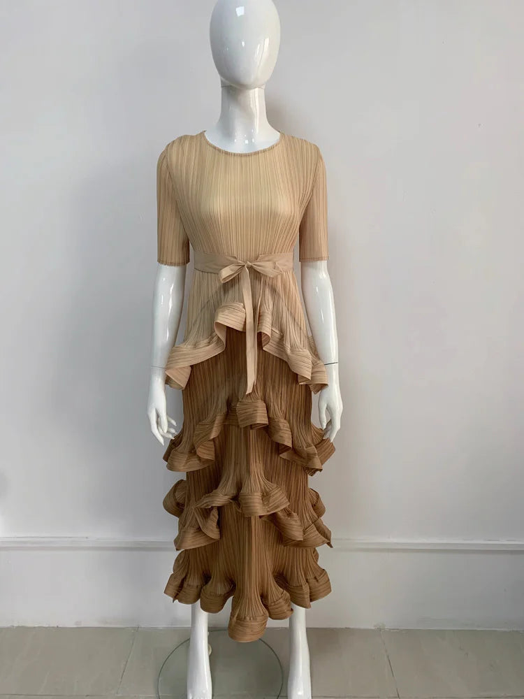 Color Block Patchwork Pleated Dress Women Elegant Round Neck Long Sleeves Belt Dresses