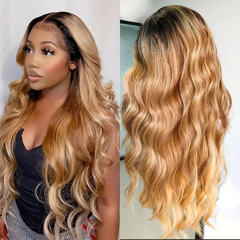 Transform your look with this 26-inch dark brown to blonde gradient body wave wig. Made from upgraded synthetic fibers, it delivers a natural, silky appearance and comfortable wear for all ethnicities. Featuring an adjustable cap and middle part, it ensures a secure fit and an elegant style perfect for cosplay, Halloween, or daily use. Easily add volume and sophistication to your hair with this versatile, unisex wig designed to enhance any outfit or occasion.