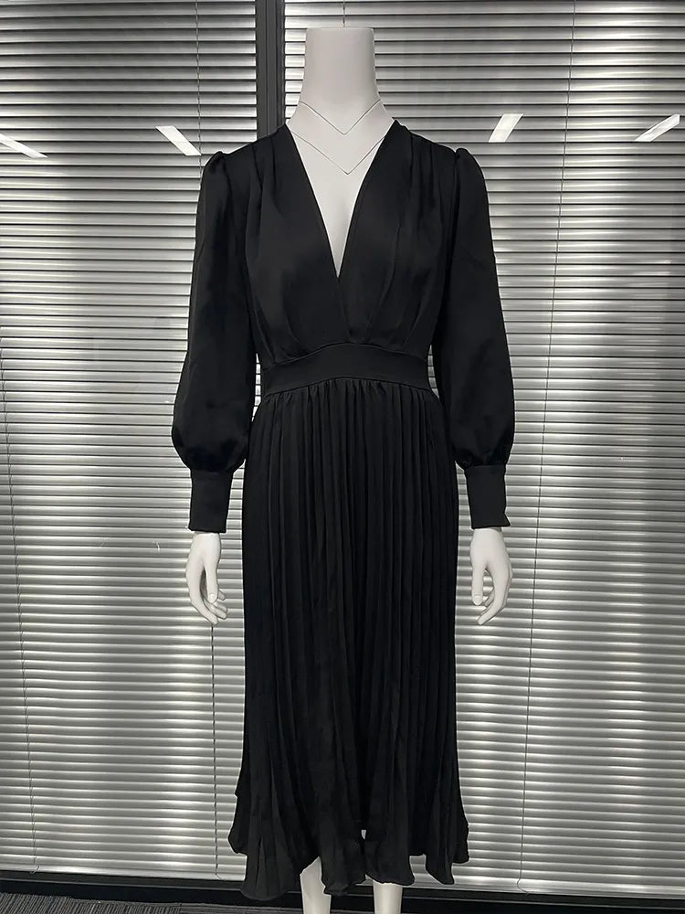 Drauuing Black Ankle Length Dresses Women V Neck Long Sleeve Loose Elegant Office Lady Fold Dresses Women Autumn New