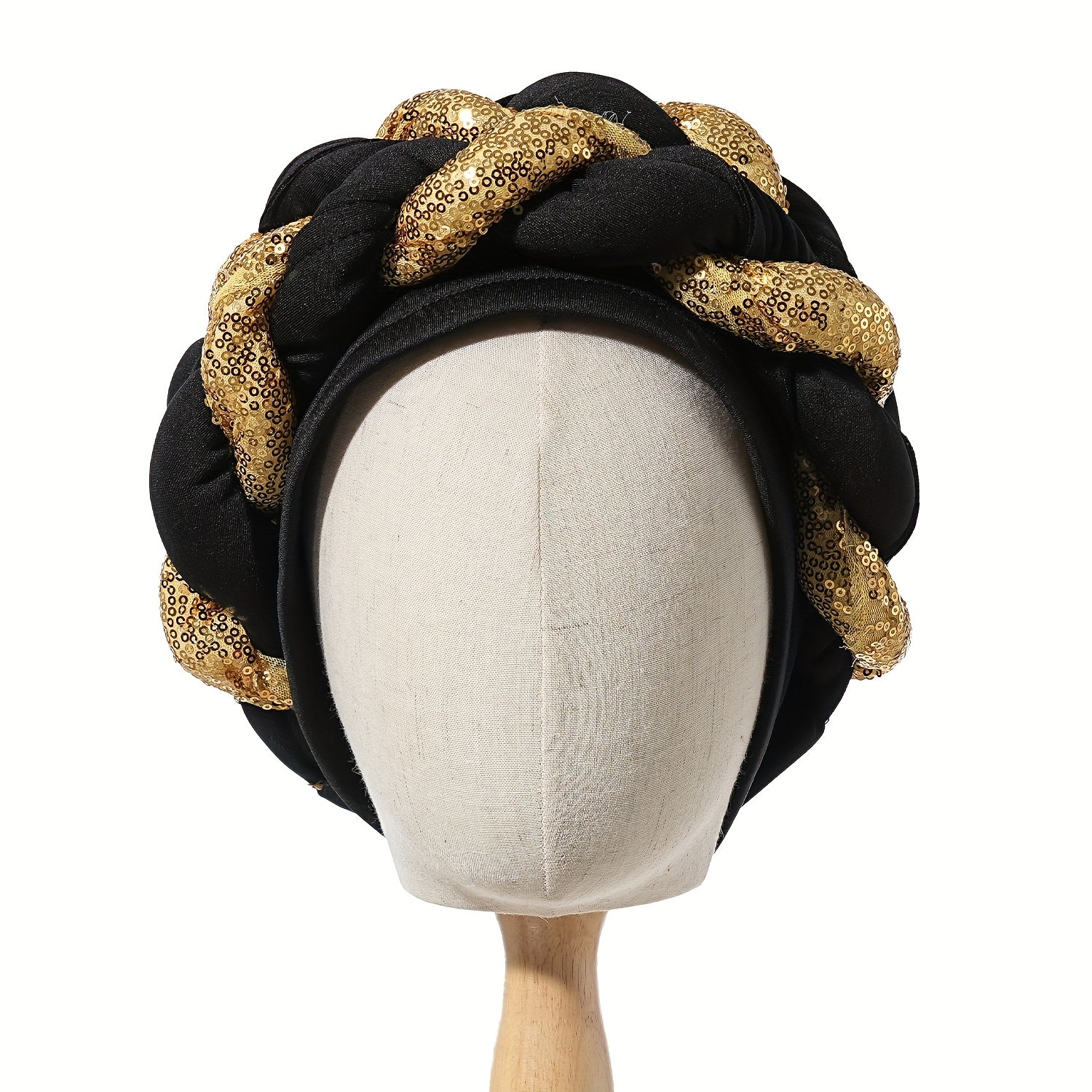 Elevate your look with this Women's Elegant Turban Headwrap featuring a shimmering golden spangle 2-strand braid detail. Crafted from lightweight, non-stretch polyester, it offers a comfortable fit perfect for weddings and festive occasions. The convenient toggle closure ensures a secure hold all day while maintaining style. Easy to care for with hand wash or dry clean instructions, this headwrap adds a touch of sophistication to any outfit.