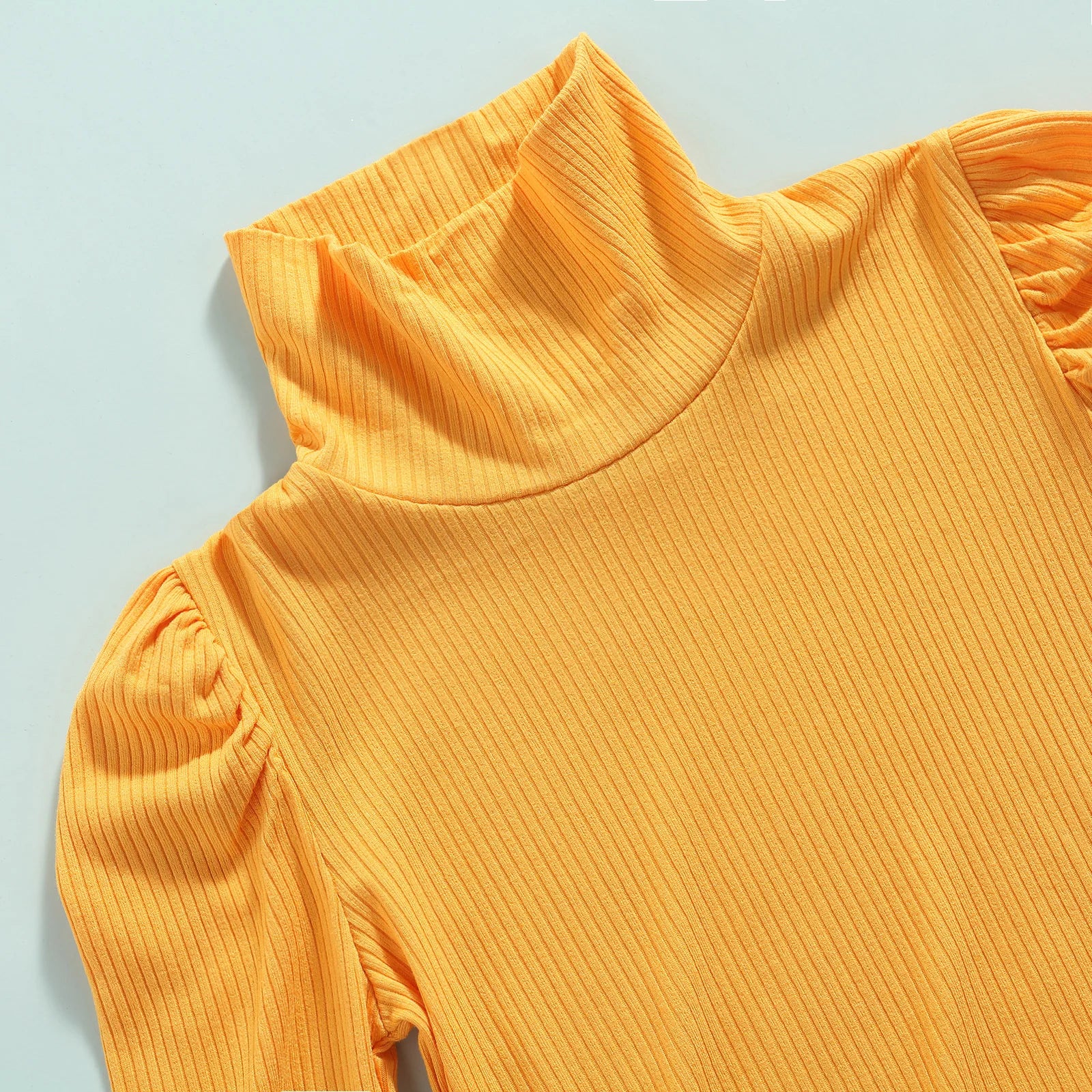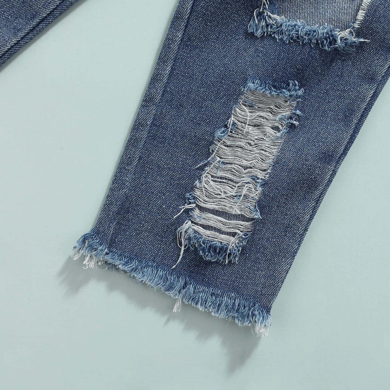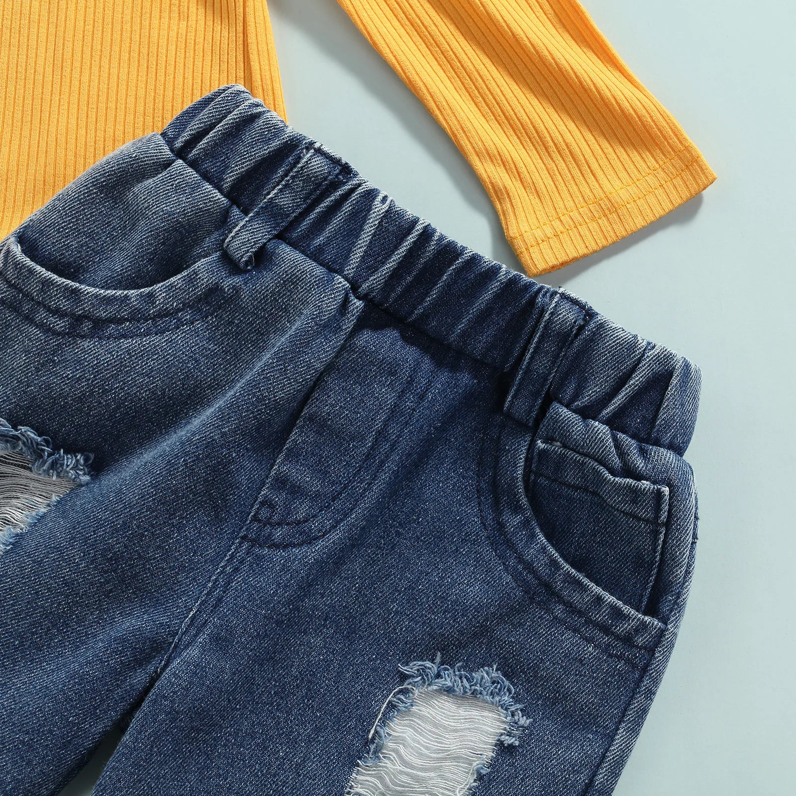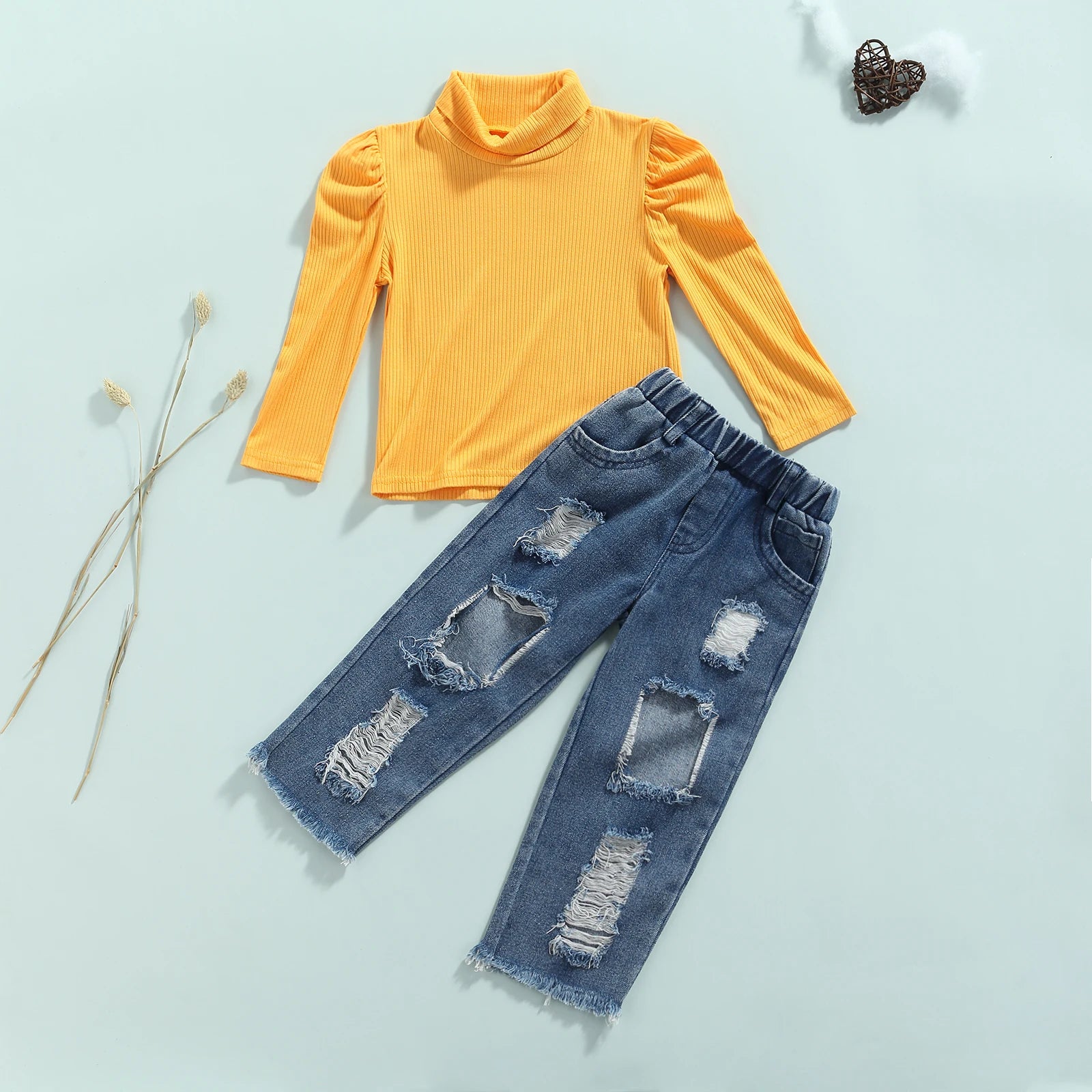Fashion Kids Autumn Set Baby Girls 2Pcs Tracksuit Solid Color Mock-Neck Long Sleeves Knit Tops + Ripped Jeans Outfits 2-7 Years