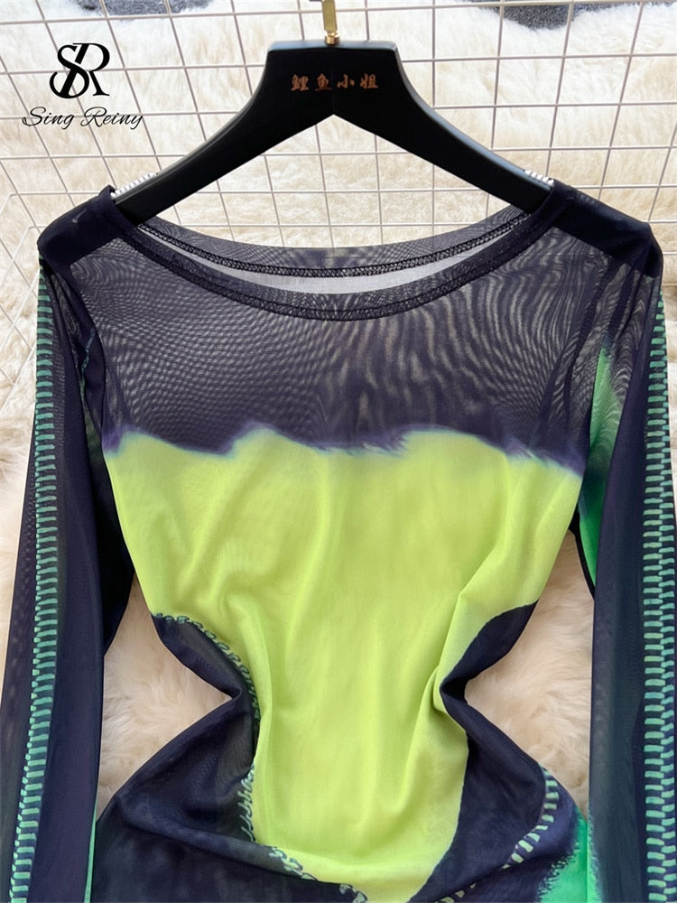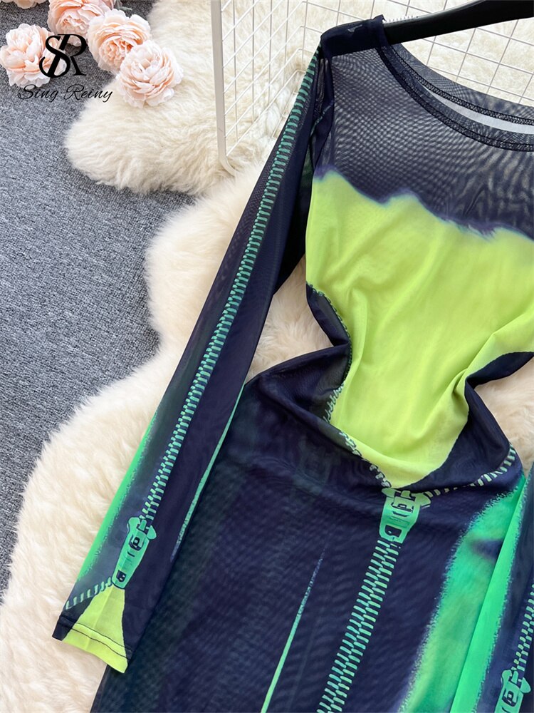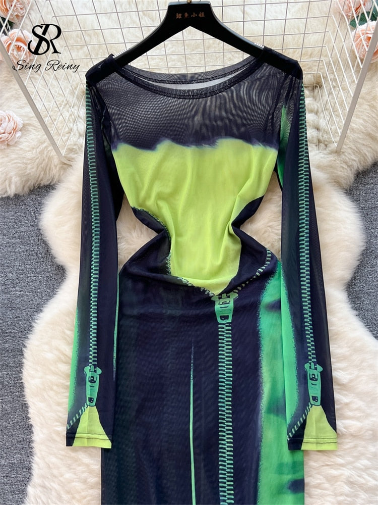 Fashion Mesh Dress Zipper Print O Neck Full Sleeves Women Retro Streetwear Autumn Bodycon Slim Fit Long Dress - London Designer