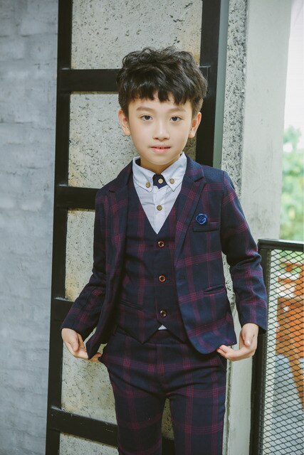 This Flower Boys Formal Wedding Suit Kids Japan Style Jacket +Pants+Vest+BowTie 4Pcs Tuxedo Suit Kids Party Host Costume is perfect for any special occasion. It features a single breasted closure, a notched collar, and a plaid pattern. The material is a combination of cotton and polyester, making it comfortable and durable. It comes in black and blue, and is suitable for spring, autumn, and summer.