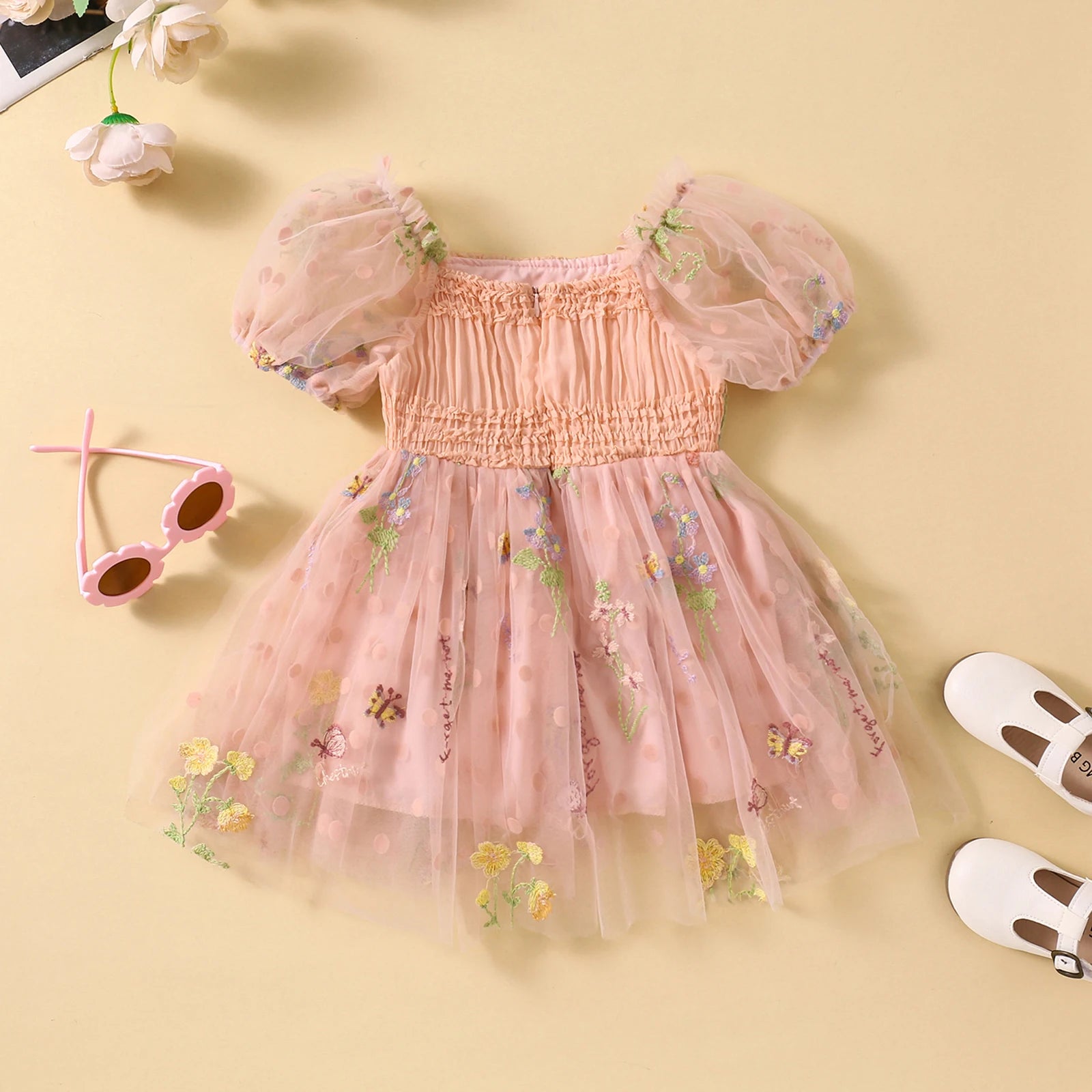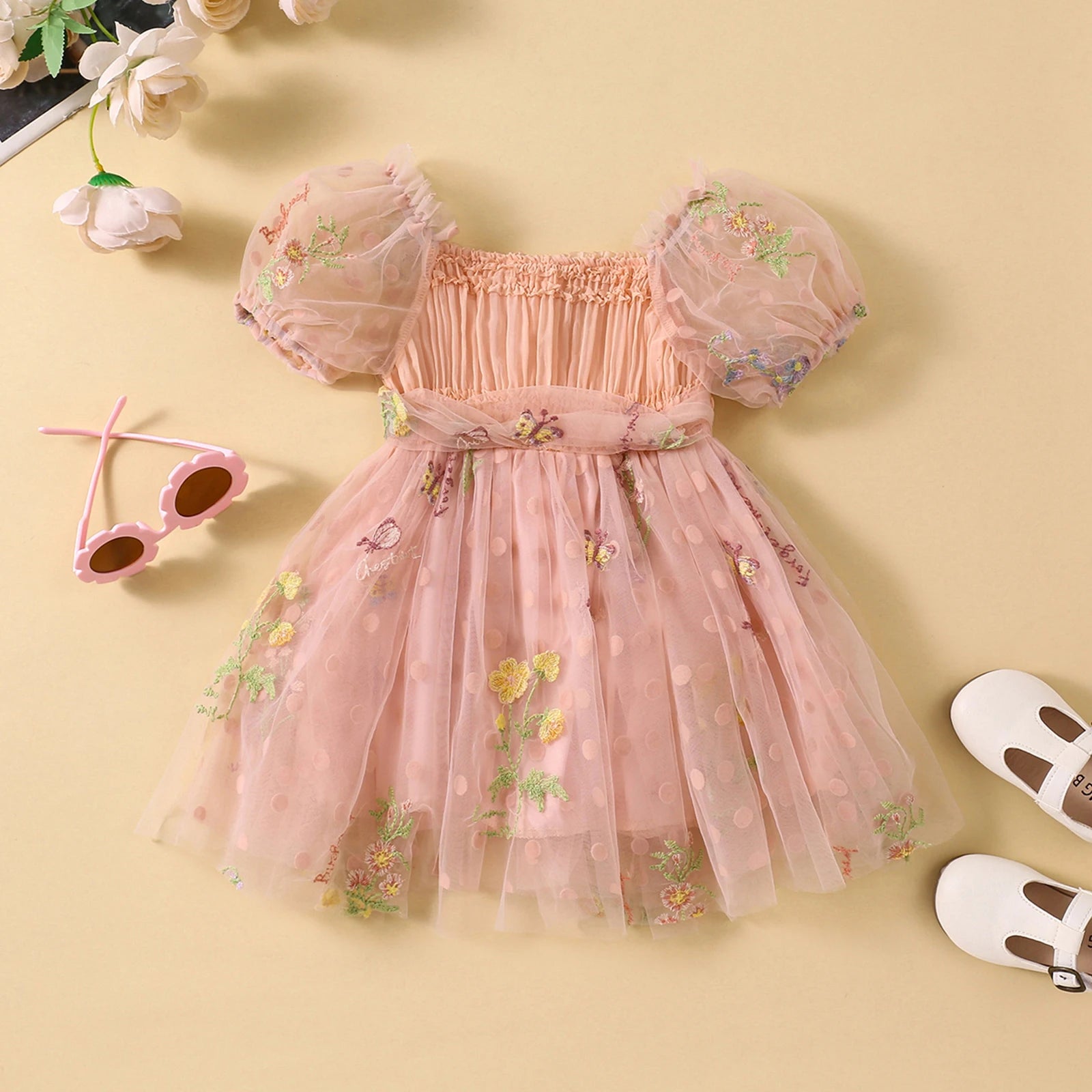 FOCUSNORM 0-4Y Toddler Kids Girls Princess Dress Mesh Short Puff Sleeve Flower Embroidered Ruched Tulle Belt Tutu Dress