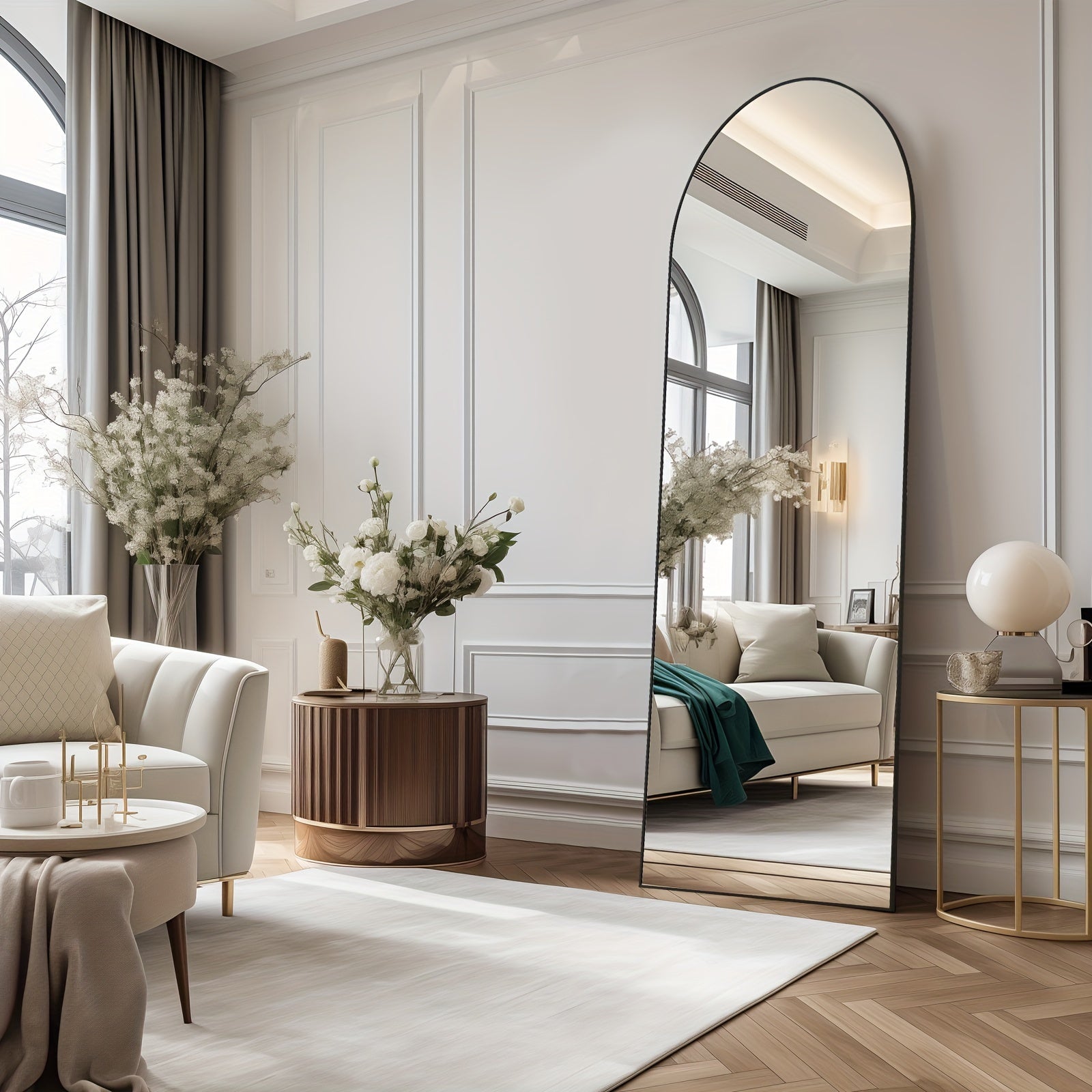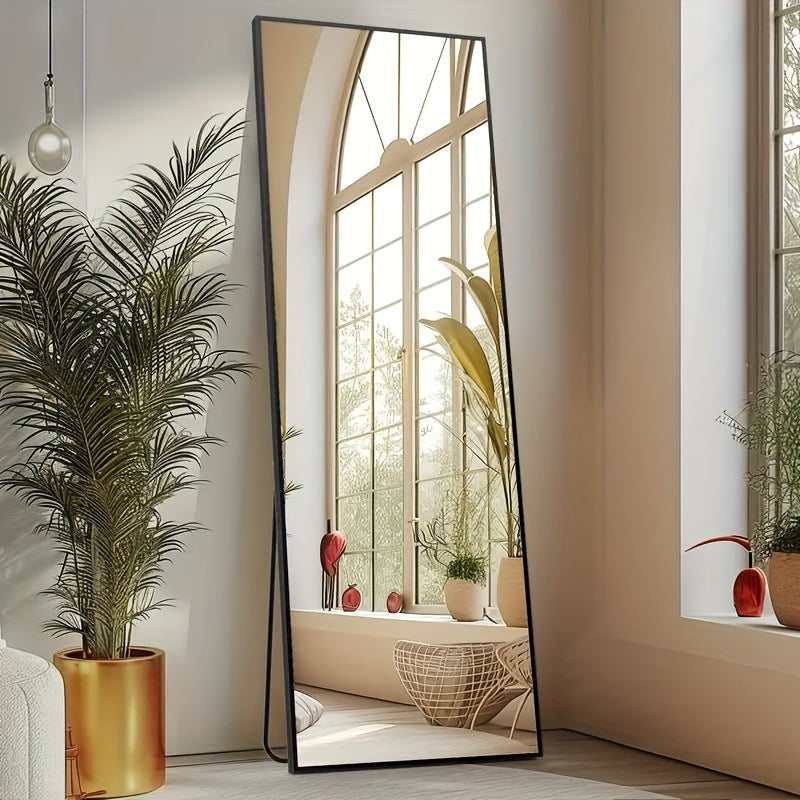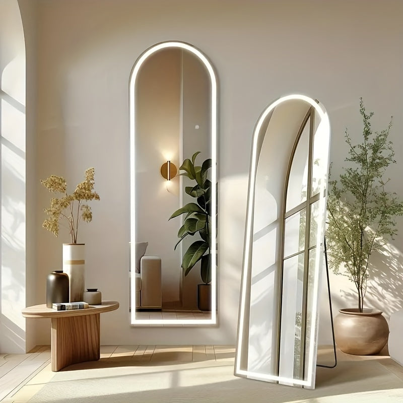 Enhance your space with this LED lighted full-length mirror featuring a stylish arched top and a sturdy aluminum frame. Perfect for bedrooms or living rooms, its floor-standing design requires no electrical outlet, offering effortless placement anywhere. Available in black, golden, or white finishes, it combines functionality with elegant decor to help you dress with confidence and ease.