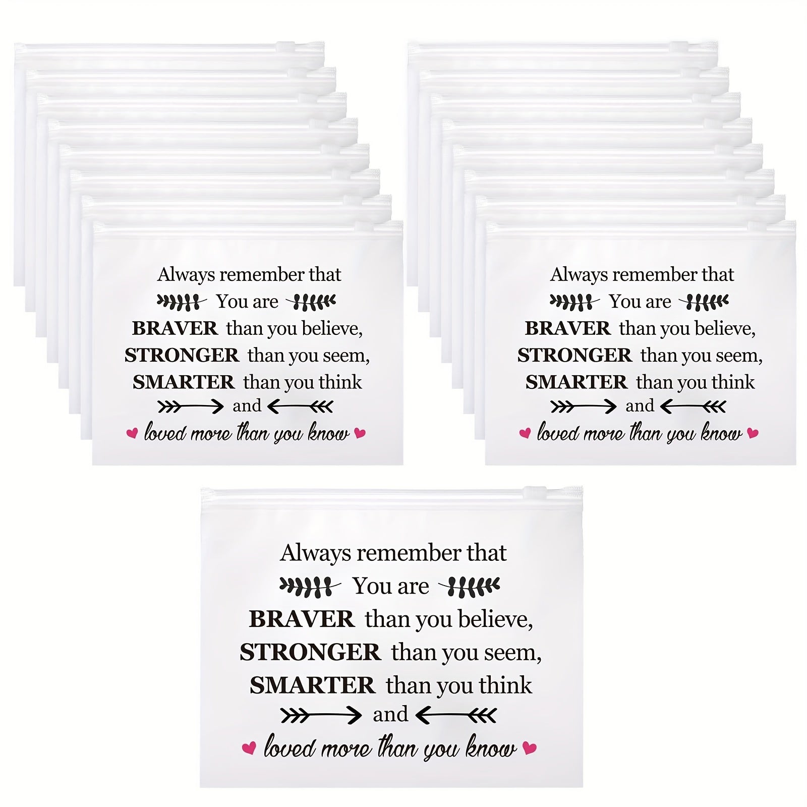 Empower the women in your life with these inspiring cosmetic bags featuring uplifting motivational quotes. This 30-piece set combines practicality with positivity, perfect for birthdays, Christmas, or everyday encouragement. Each durable EVA travel toiletry bag features a secure zipper closure, making it ideal for organizing makeup, skincare, or personal essentials on the go. The "You Are Braver" message serves as a daily reminder of inner strength and confidence. Whether gifting to friends, family, or colleagues, these affordable bulk bags deliver both functionality and heartfelt inspiration that resonates long after the wrapping comes off.