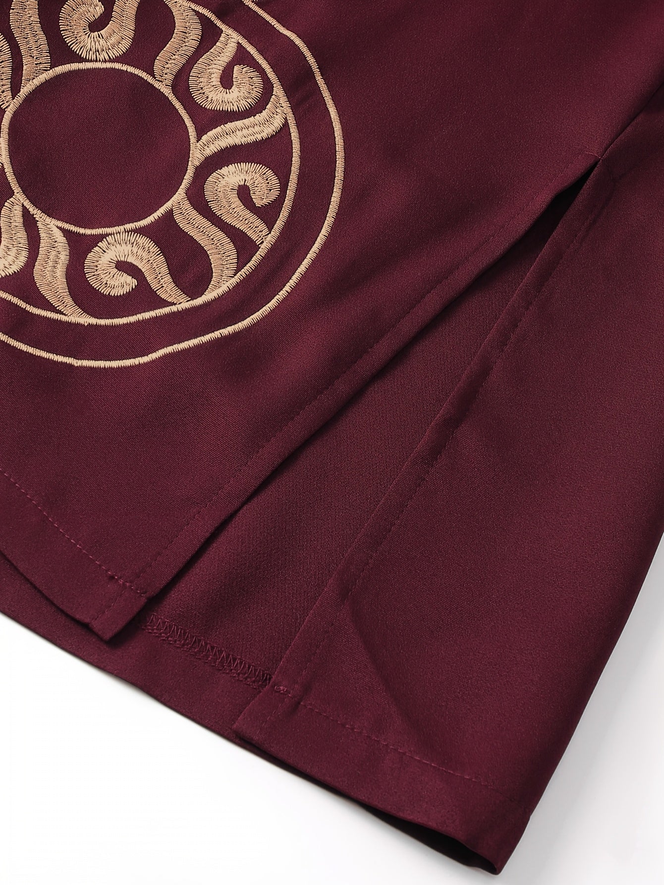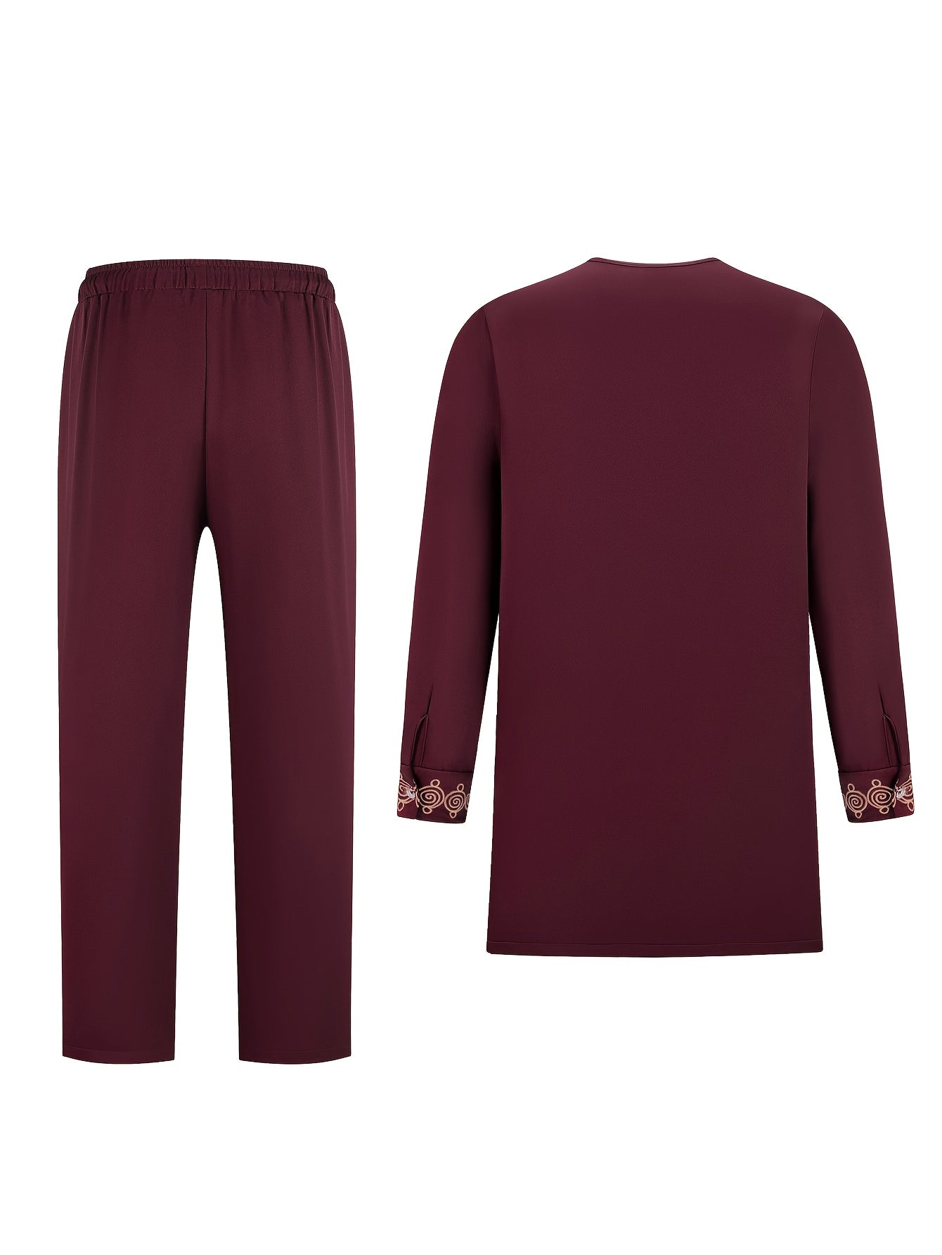 Experience rich cultural heritage with this Men's African-Style 2-piece set featuring an embroidered dashiki and drawstring pants. Designed for comfort, its loose fit and non-stretch fabric ensure durability and breathability—perfect for year-round wear. The vibrant maroon color with golden geometric accents highlights traditional artistry, while the vintage crew neck adds timeless appeal. Embrace bold style and cultural pride in an outfit that blends tradition with everyday ease.