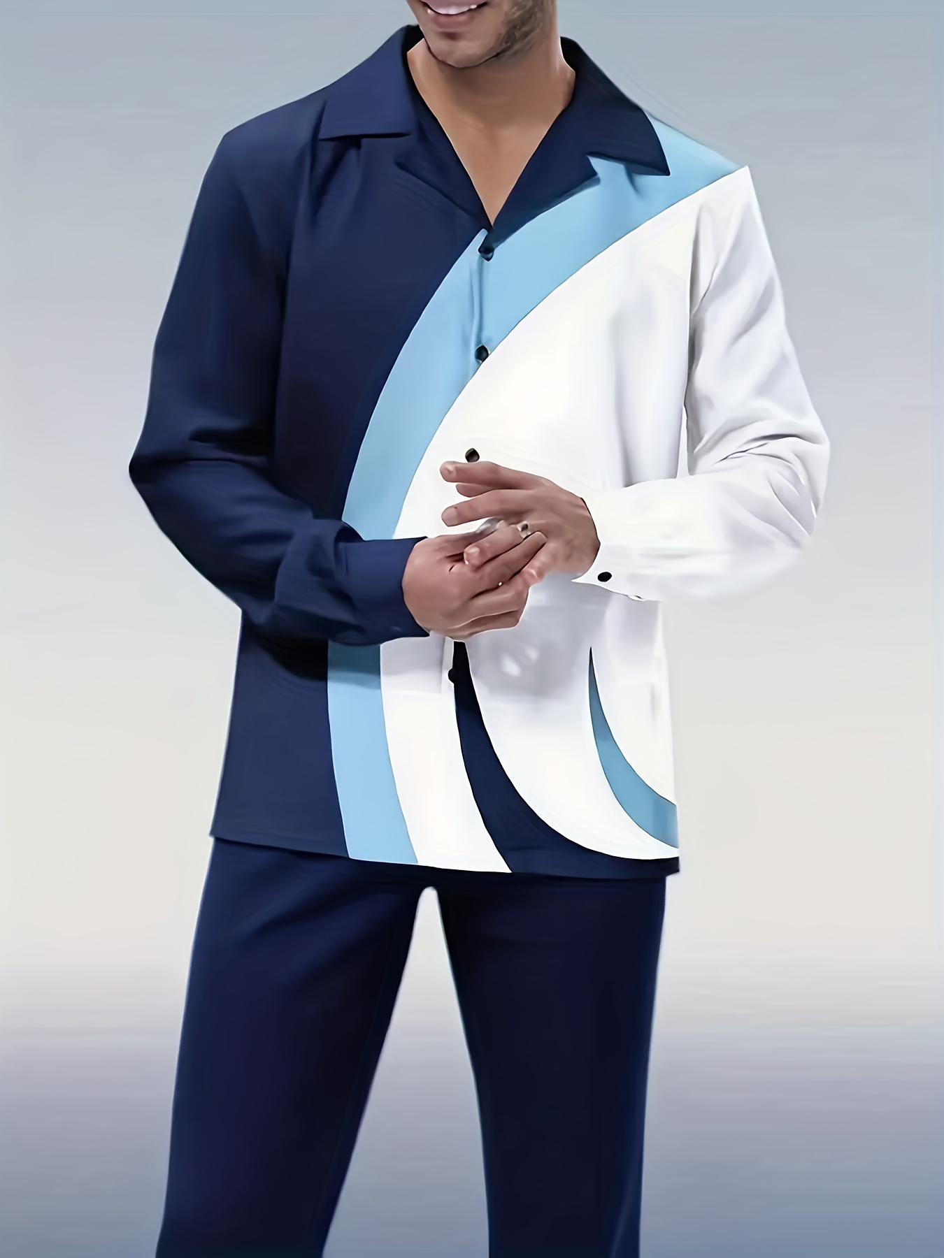 This men’s suit combines a striking 3D color block print lapel shirt with solid loose-fit trousers in navy contrast, perfect for transitioning from casual to semi-formal occasions. Designed for spring and autumn wear, its long sleeves and wrinkle-resistant fabric ensure you look sharp all day without the hassle of ironing. Ideal for work or relaxed settings, this easy-care outfit offers both style and convenience for the modern man.