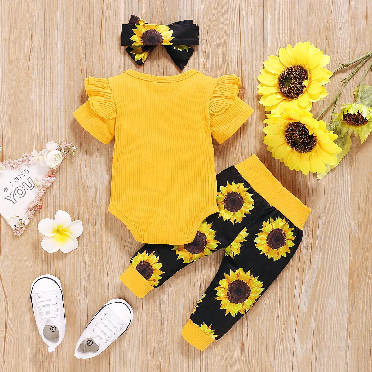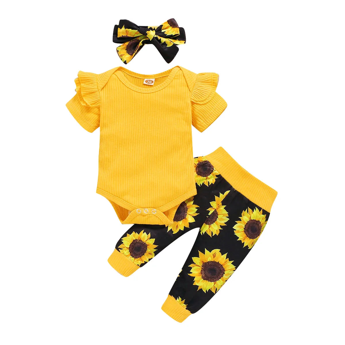 Complete your newborn's summer wardrobe with this versatile three-piece set. The short-sleeve ruffle top pairs perfectly with matching sunflower floral pants, while the included headband adds an extra touch of charm. This coordinated collection offers multiple styling options, giving you flexibility for different occasions and moods. Crafted with soft, breathable fabrics ideal for warm weather, each piece works independently or together for maximum versatility. From casual outings to photo sessions, this thoughtfully designed set ensures your baby girl stays comfortable and picture-perfect all summer long.