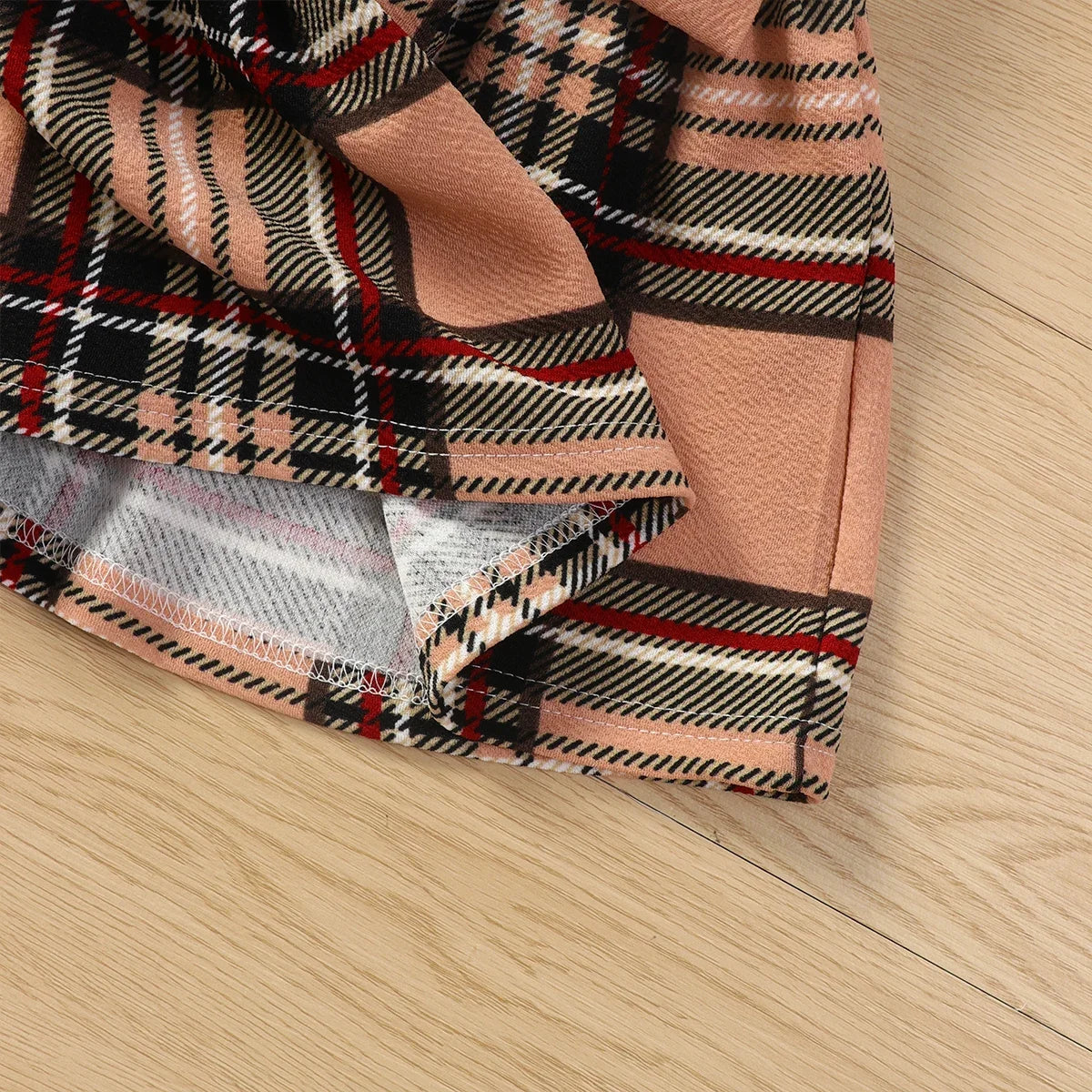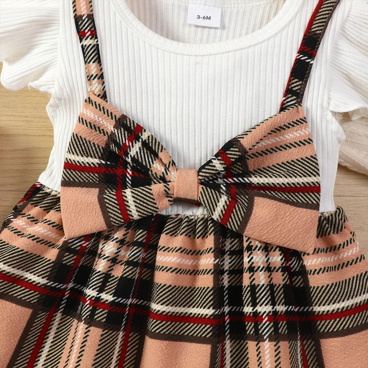 2pcs Baby Girl Flutter-sleeve Splicing Plaid Bowknot Dress with Headband Set Soft and Comfortable