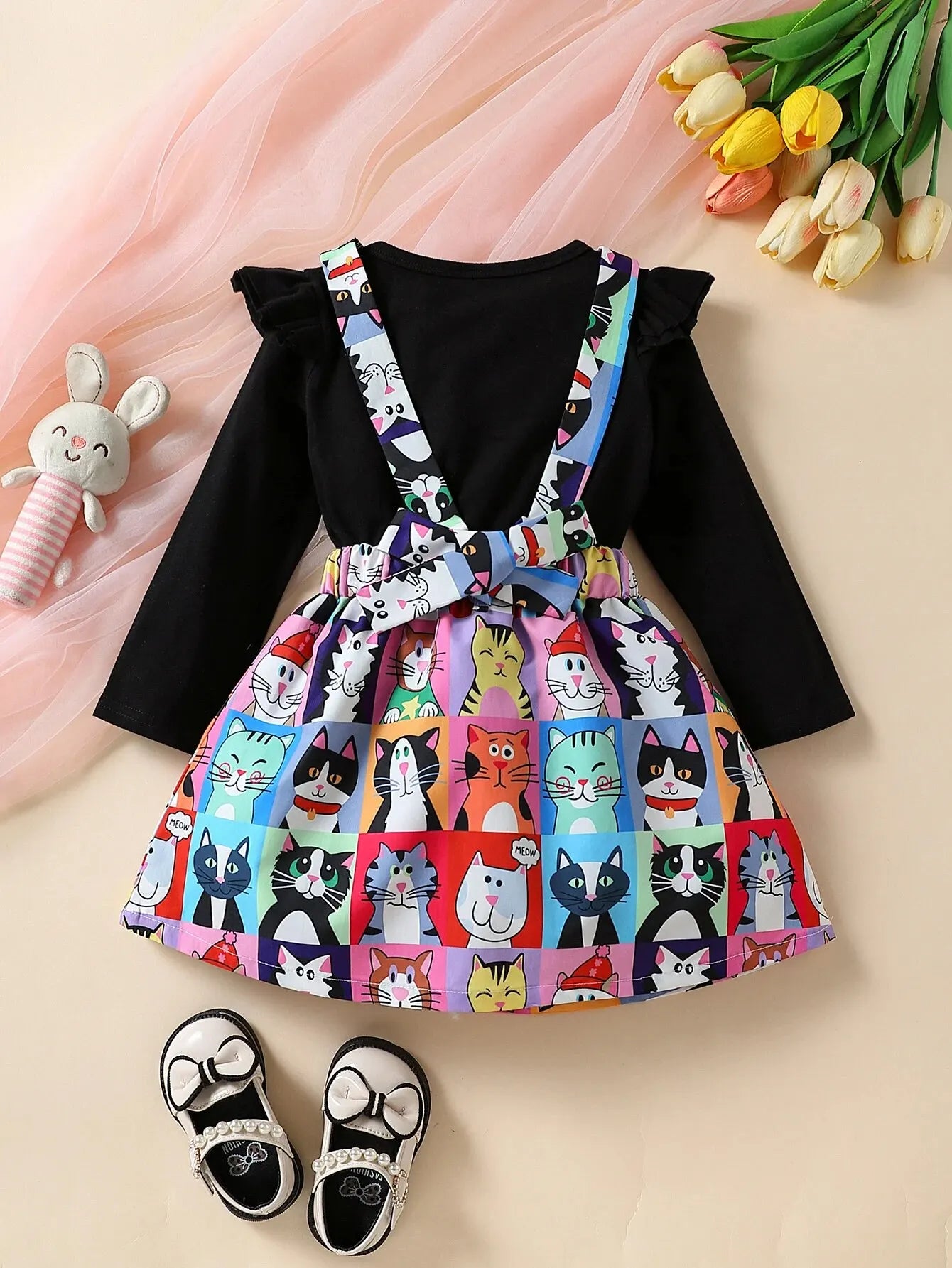 Toddler Girl Clothes Spring Autumn Ruffles Long Sleeve Shirt CARTOON Cat Print Suspender Skirt Kids Children 2Pcs Outfits Set
