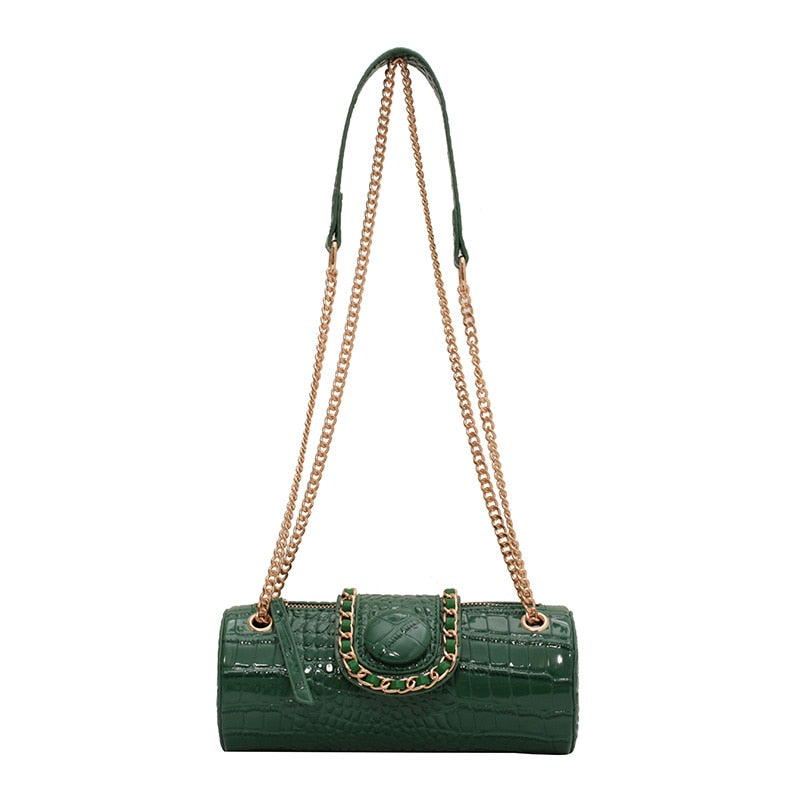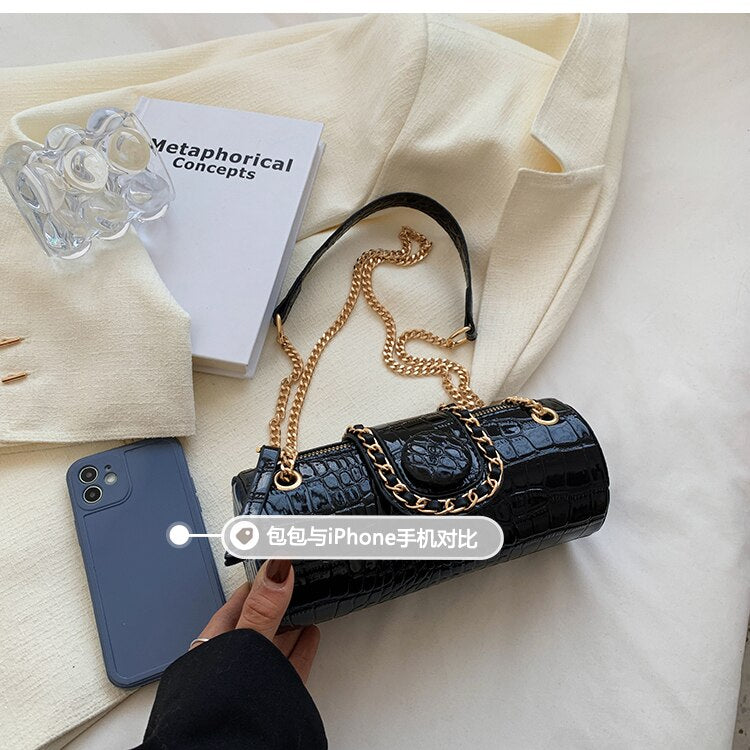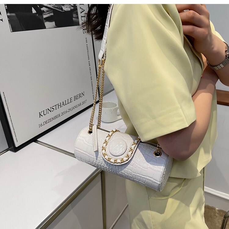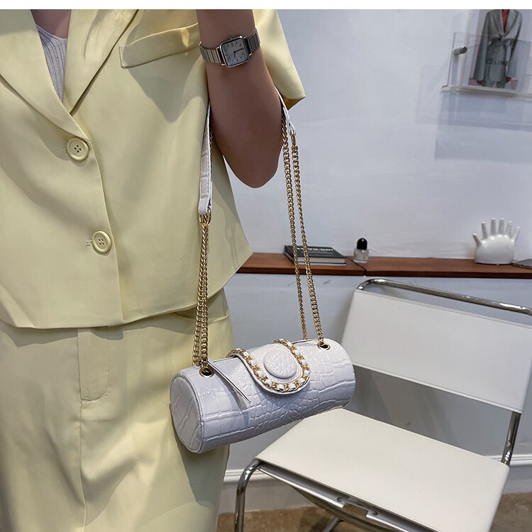 This Tote Barrel PU Leather Women Handbag Shoulder Messenger Bag is a stylish and fashionable accessory. It features a barrel-shaped design and is made of PU leather. It has a single handle/strap and comes with a zipper and hasp closure. The interior is lined with polyester and has an interior slot pocket. It also has an exterior flap pocket and is decorated with chains. This bag is versatile and perfect for any occasion.