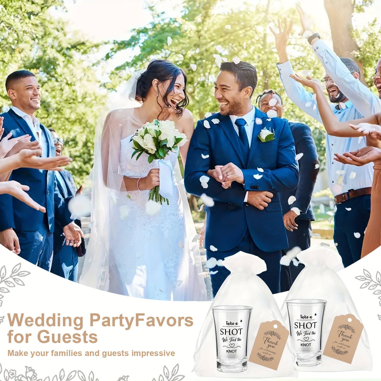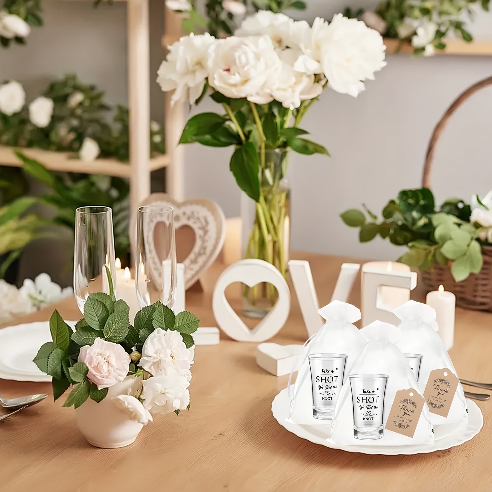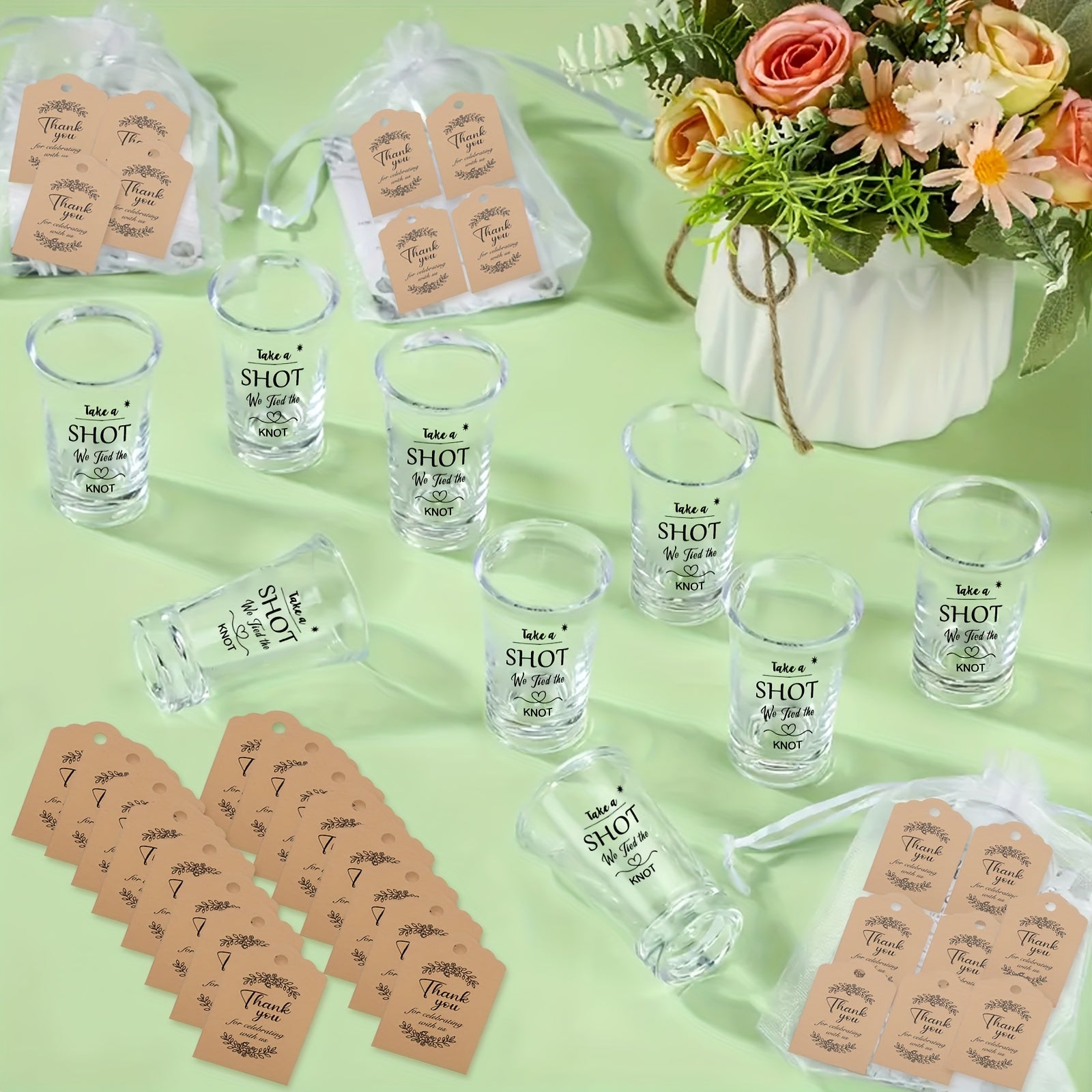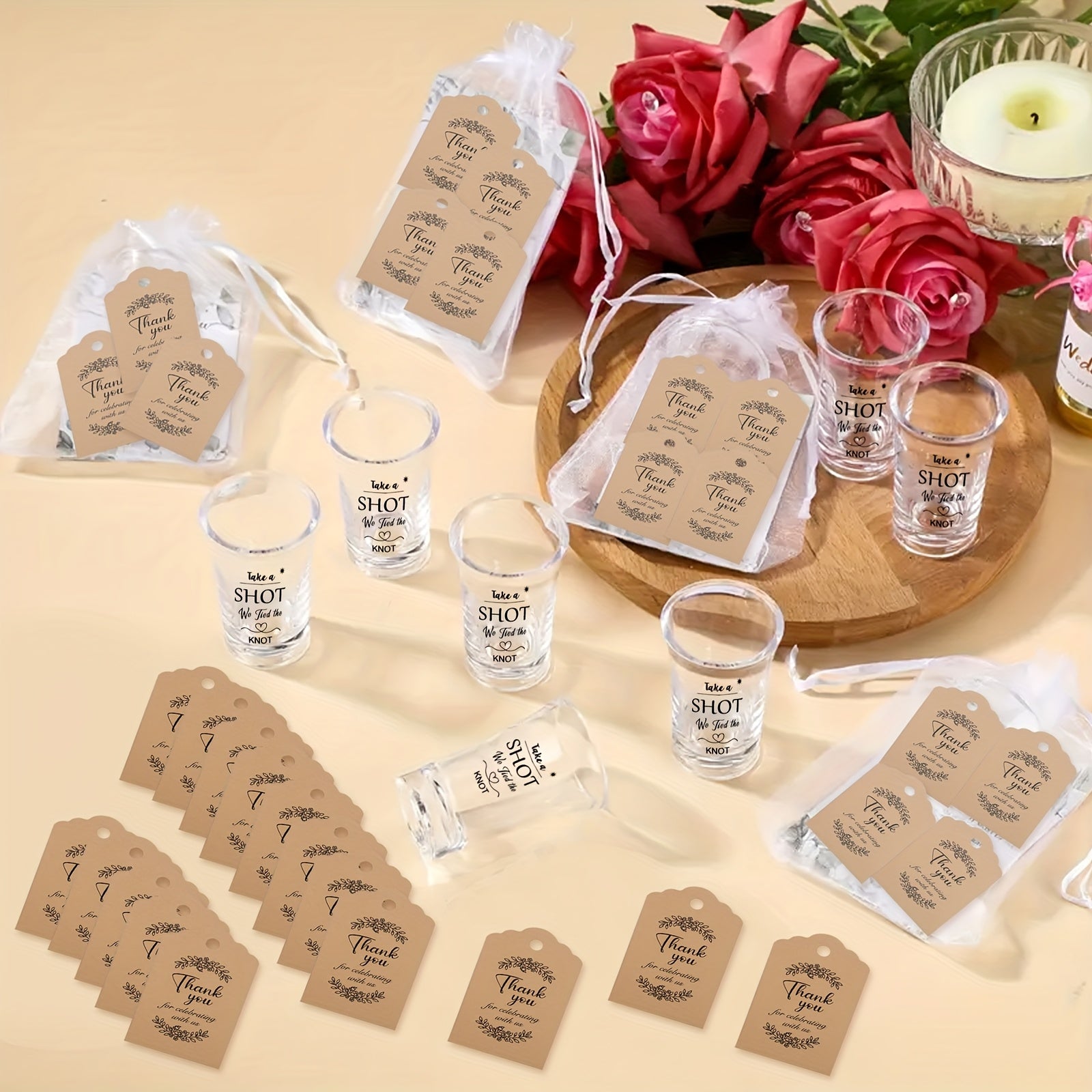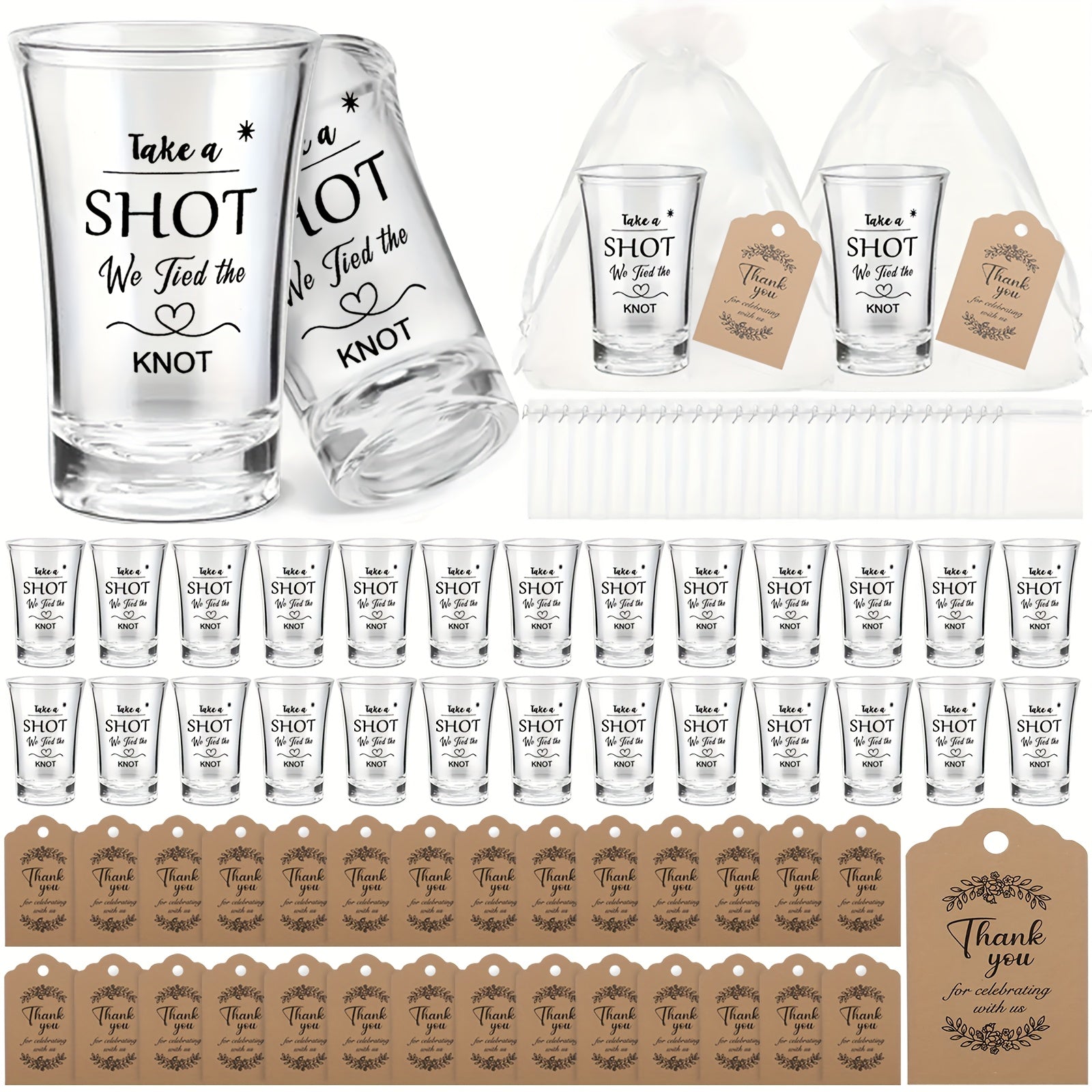 Celebrate your special occasion with this 90-piece set of wedding favors, including 30 clear acrylic shot glasses paired with thank you cards, delicate organza bags, and fun "Take A Shot We Tied The Knot" stickers. Perfect for engagements, bridal showers, weddings, or birthday parties, these favors add a memorable and stylish touch for your guests to enjoy and cherish. Make your event unforgettable with these ready-to-use, elegant keepsakes.