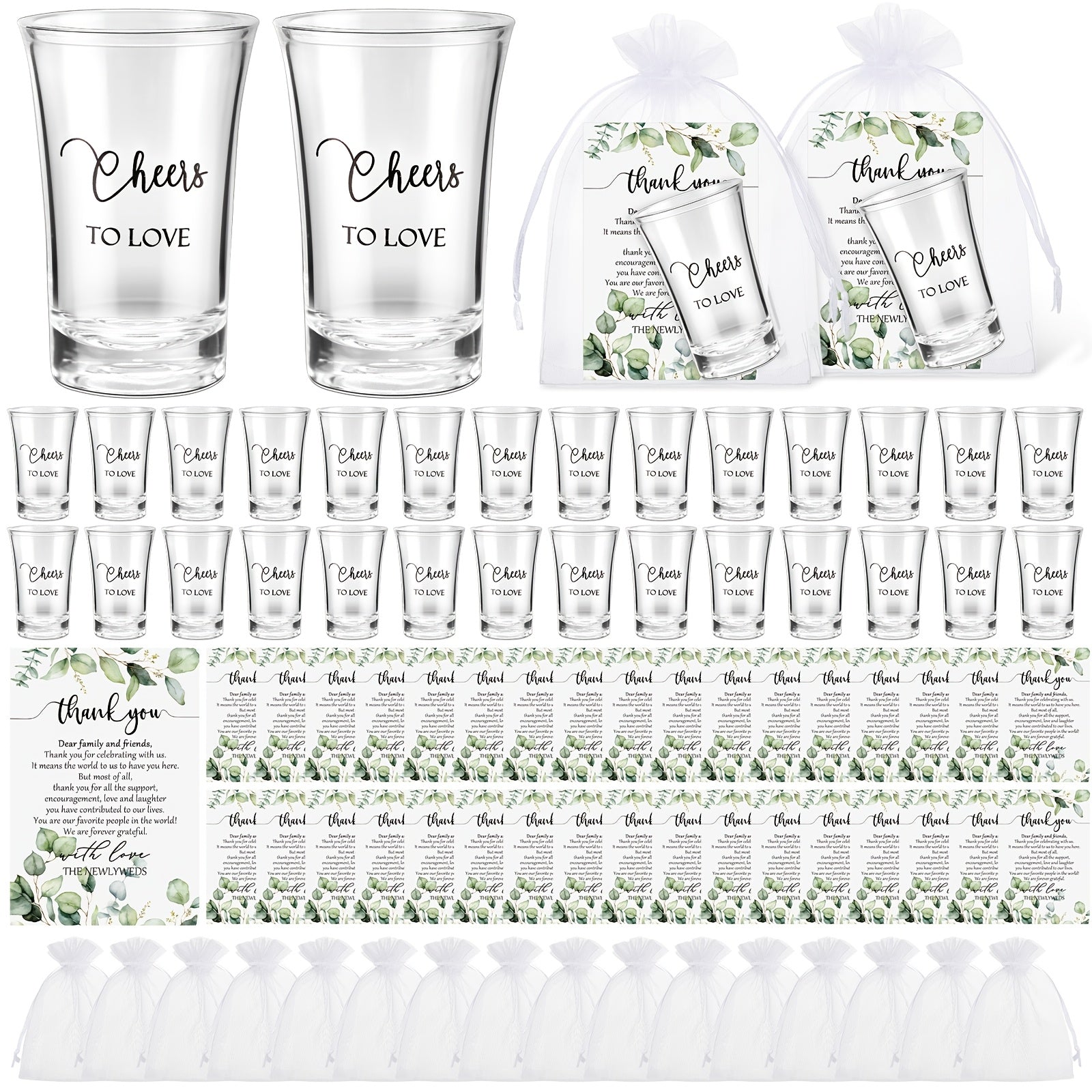 Make your wedding celebration unforgettable with this set of 50 clear acrylic shot glass favors, each printed with "Cheers To Love." Designed for durability and elegance, these short glasses come paired with matching wedding thank you cards and delicate organza bags. Perfect for thanking guests with a charming keepsake, these favors add a heartfelt touch to your special day while keeping your celebration stylish and memorable.