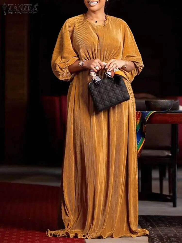Women Elastic Waist Robe Party Elegant Solid Maxi Dress Fashion O-neck Half Bat Sleeve Pleating Dresses Oversized