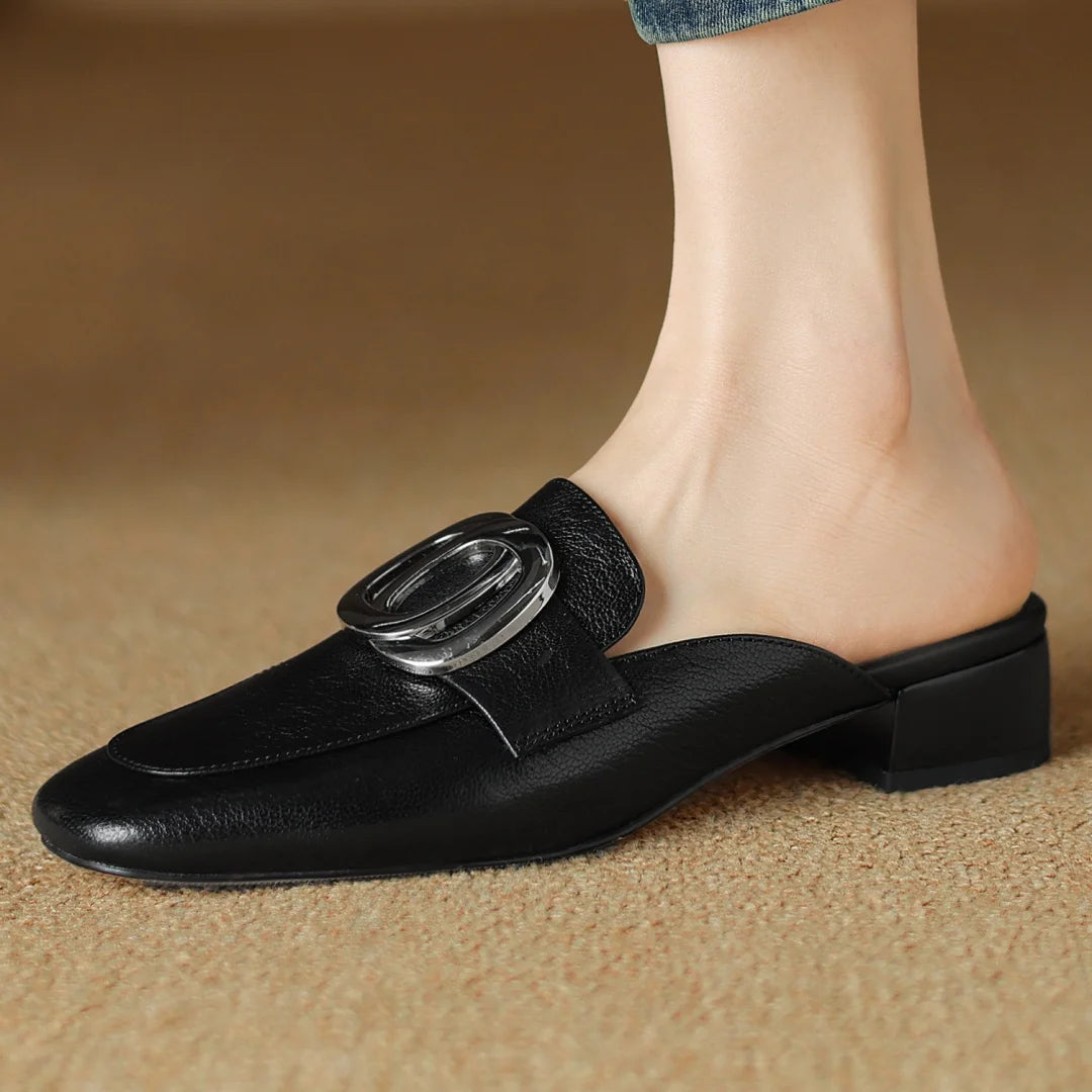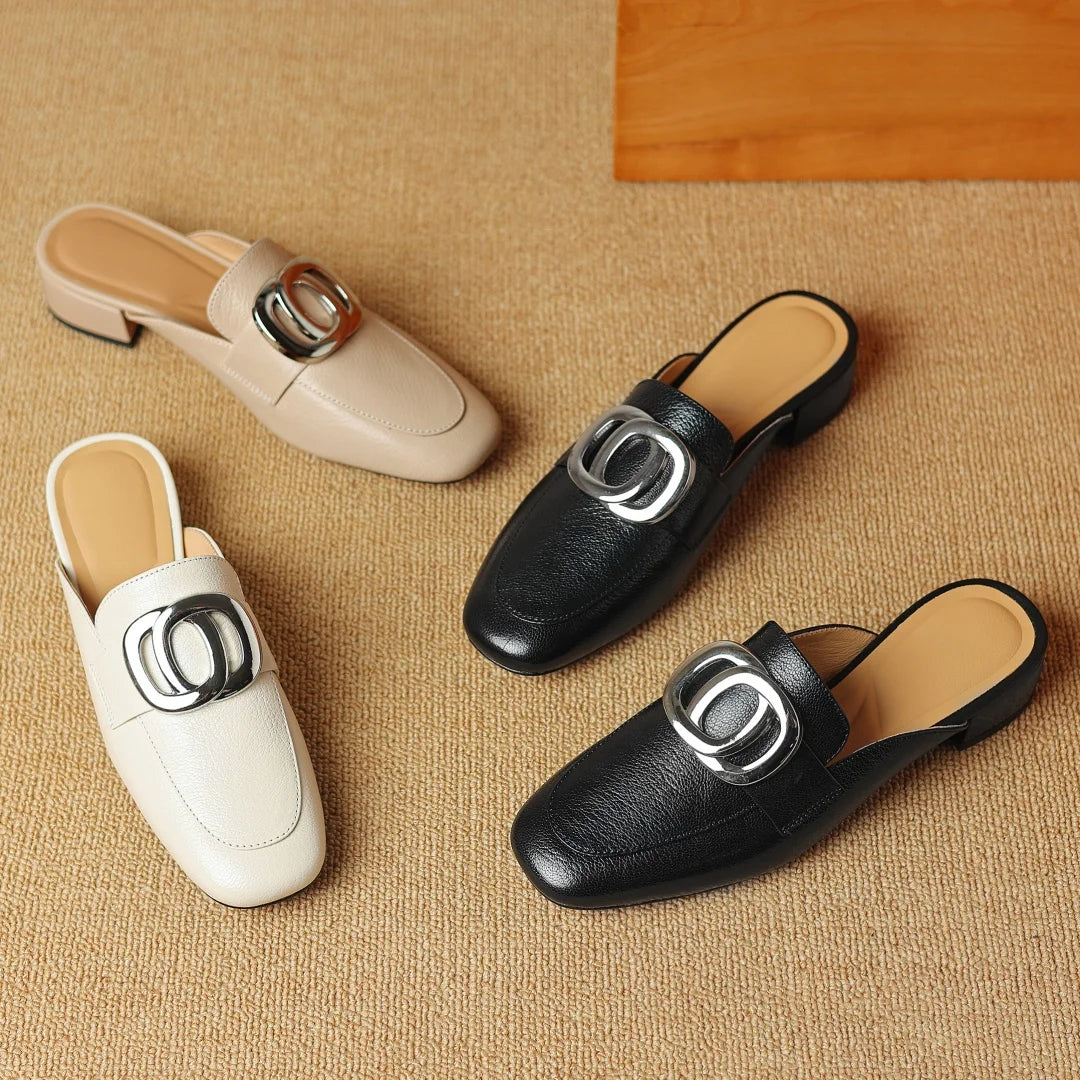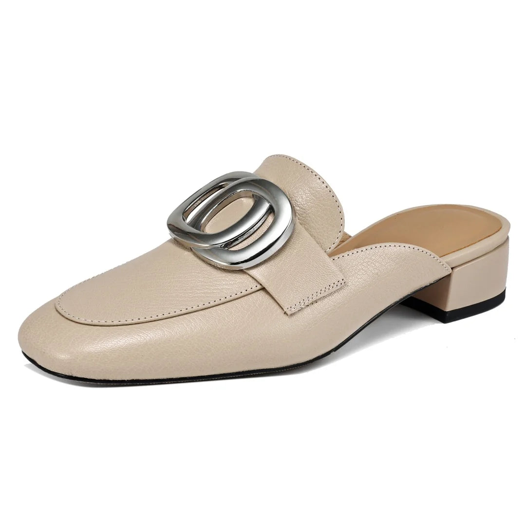 Experience casual elegance with these genuine leather mules designed for the modern woman. The slip-on style makes getting dressed effortless, while the square toe and metal buckle detail add modern appeal. Available in extended sizes 34-41, these versatile mules work perfectly for casual summer outings. Quality genuine leather ensures durability and all-day comfort.