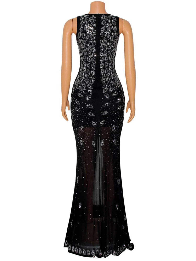 Women Sexy V-Neck Sheer Mesh Rhinestone Decor Tight Mermaid Dress
