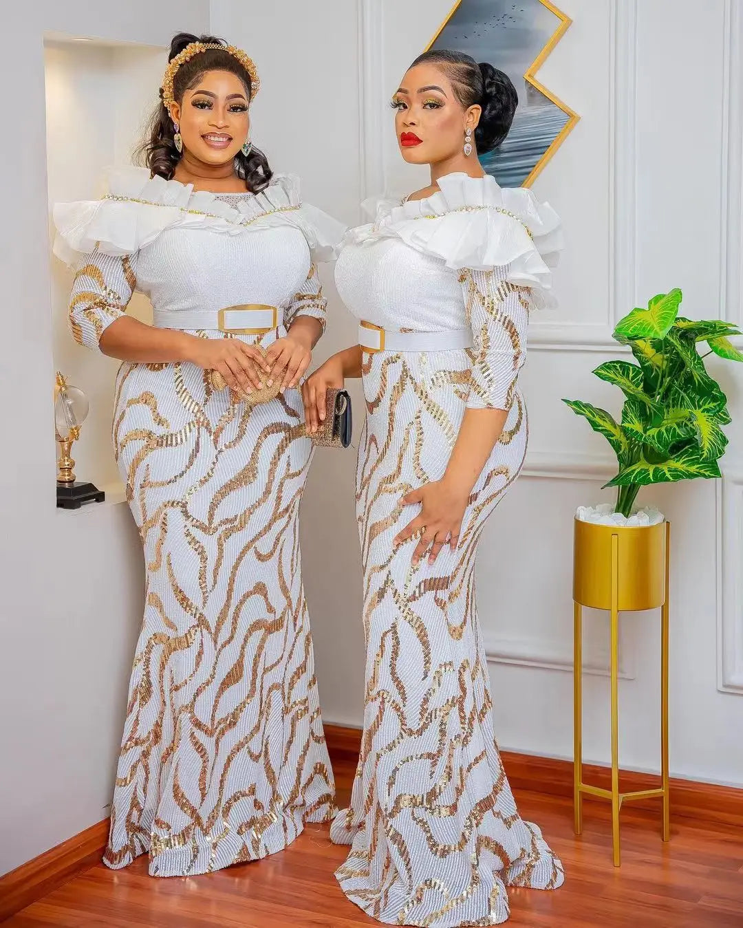 This Women V-neck Sequined Long Dress is a stylish and elegant choice for any occasion. It is made from high-quality polyester fabric and features a round neckline and long length. The dress is available in white, green, and black colors and comes in sizes XL, 2XL, 3XL, and 4XL. The sequined detailing adds a touch of glamour to the dress, making it perfect for special occasions.