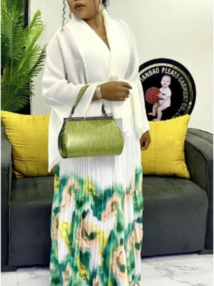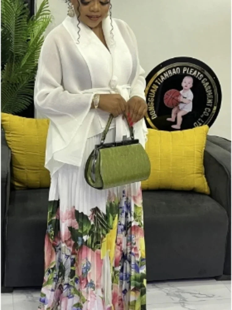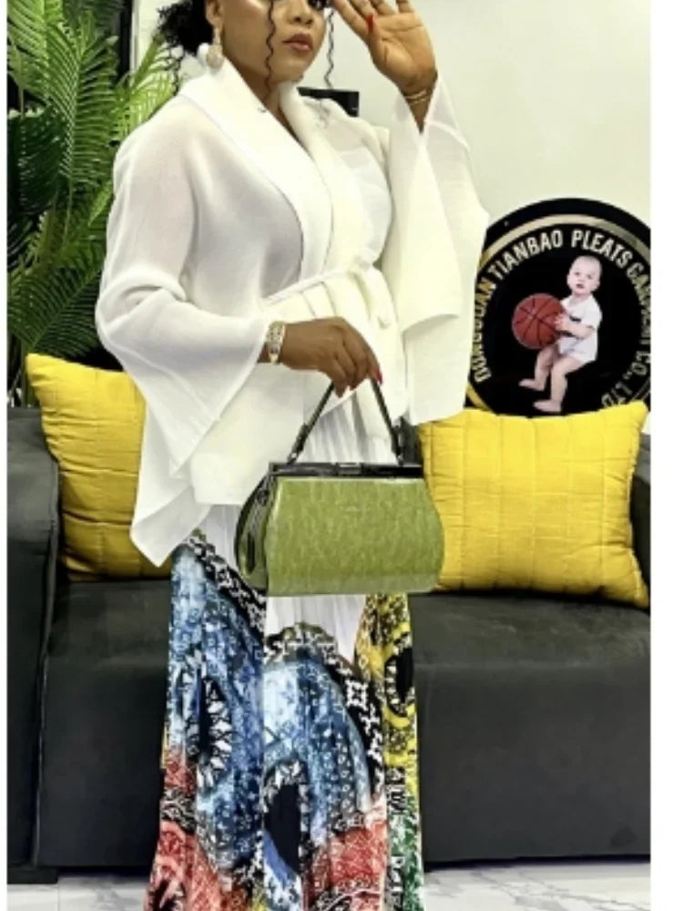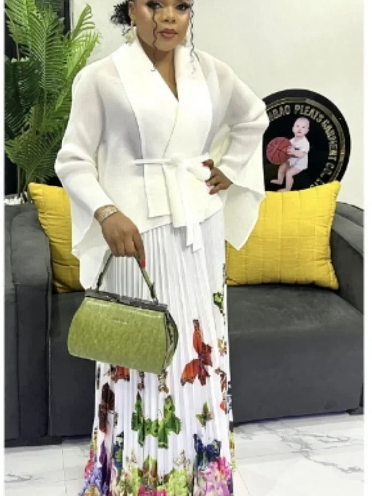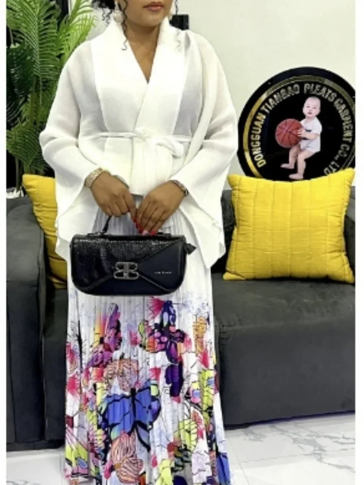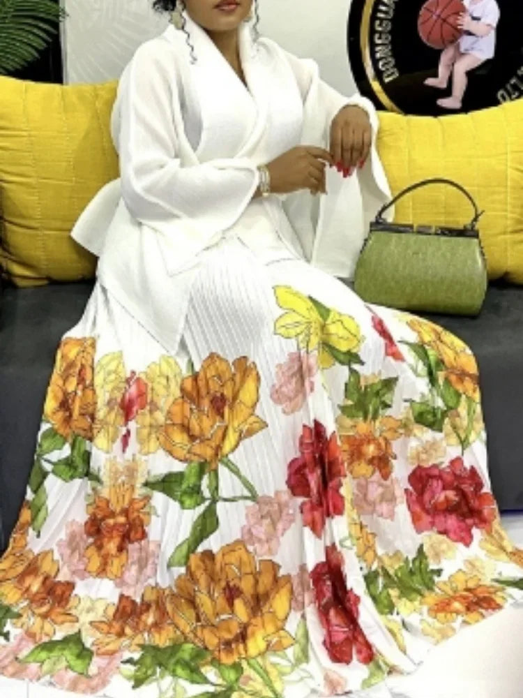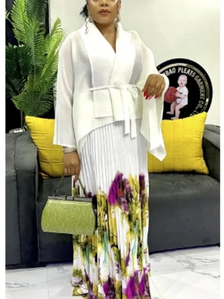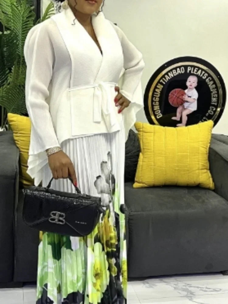 Elevate your wardrobe with this striking two-piece women's suit featuring a pleated long sleeve lace-up top paired with a printed big swing skirt. The lace-up detail adds a trendy touch to the elegant top, while the flowing skirt offers comfort and movement. Perfect for making a stylish statement at any occasion, this set combines sophistication and flair effortlessly.